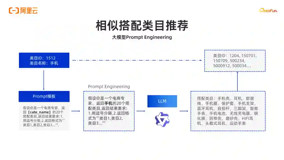 我们在阿里内部的淘宝天猫上积累了一些经验,特别是在 Prompt Engineering 方面。第一个实践是使用 LLM 进行类目搭配推荐,因为 LLM 具有大量的领域外知识。例如,如果你给它一个类目名称“手机”,它会推荐手机壳、耳机、数据线、手机膜等相关类目。这是 LLM 利用其通用能力的一种体现。通过 Prompt 模板,给 LLM 一个类目名,它就会帮助生成相关的类目。但这些生成的类目在真正用于线上时,还需要转化为实际的线上类目 ID。这是一个常见的应用场景。