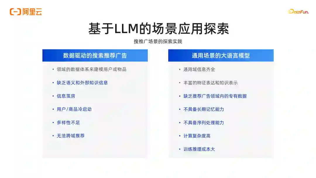 在搜推广场景的实践中,经典的搜推广通常由数据驱动。例如,淘宝利用用户行为和商品数据构建推荐模型,知乎则使用用户与内容的数据进行推荐。这种方法往往是领域内的数据建模,淘宝无法回答知乎的问题,知乎也无法处理淘宝的商品推荐。这导致信息茧房,推荐内容局限于内部数据,无法回答通用问题。此外,还涉及用户和商品的冷启动问题。对于新用户,没有任何行为数据,只能采用经典冷启动方法。同样,新商品发布后,由于没有历史数据,很难快速曝光。而且推荐的多样性不够,无法跨领域推荐。反观通用 LLM,其知识面广泛,能够回答各种问题,并且知识表达能力丰富。然而,LLM 缺乏推荐广告领域的专有数据,也不具备序列记忆能力,无法有效处理用户的长期行为记录。最关键的是,大模型在推荐场景中性能复杂度很高,推理成本也很大。