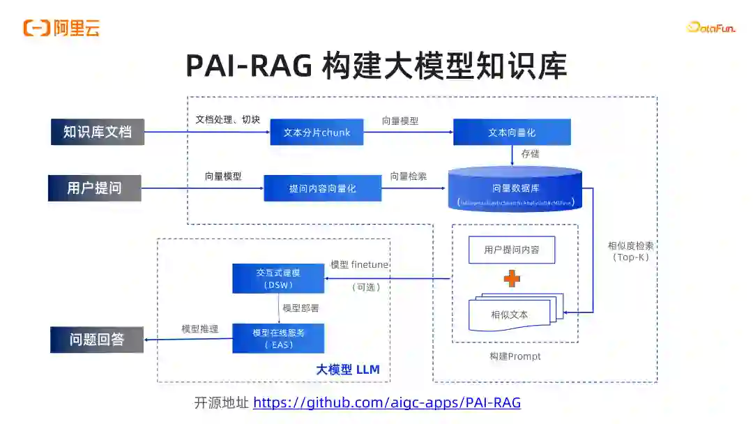 最后一个场景是在 RAG 上的探索,结合企业客户使用大模型的实践。企业有大量知识库,这些知识库文档需要分片并转化为向量,存储在向量数据库中。目前的向量数据库有 ElasticSearch、Hologres、Milvus 等。在线请求时,用户提问通过 embedding 模型转化为向量,然后在向量数据库中检索,相似度检索结果取出 Top-K 后交给 LLM,提供上下文背景,构建 Prompt,最终生成回答。