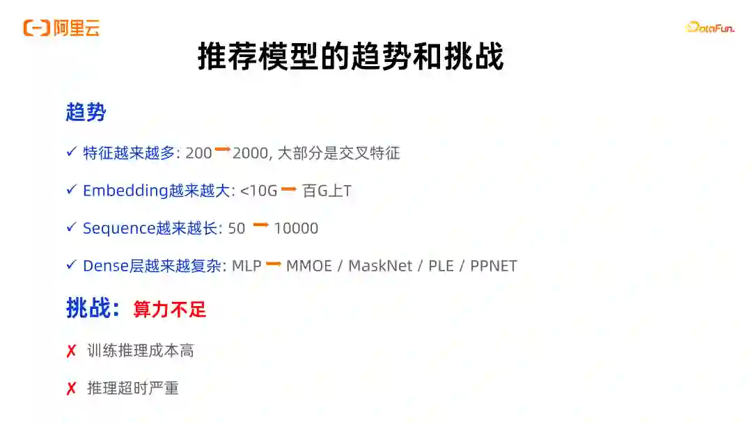随着大模型和 user/item Embedding 的引入,为了追求更佳的推荐搜索效果,模型特征和网络结构越来越复杂。原本数百维的特征膨胀到数千甚至上万维,其中包含大量交叉特征。对应的 Embedding 日益庞大,由数十 G 扩展到上百 G 甚至 T 级别,以期获取更强的表征能力。此外,行为序列(Sequence)长度也从原本的 50 个行为扩展到上万个长度。这样的复杂性带来挑战:追求更好效果的同时,训练的资源需求和速度要求不断增加,算力严重不足。然而,复杂的推理过程也导致推理延时增加,而推理是实时请求过程,因此推理超时严重是一个急需解决的问题。