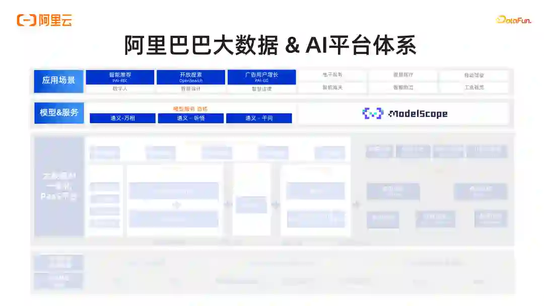 在大数据和 AI 平台上,百炼模型服务平台是面向开发者的大模型开发平台。百炼整合了达摩院通义实验室的多项大模型能力,如图像处理的通义-万相、语音识别的通义-听悟,以及文本处理的通义-千问。此外,还包括了开源社区 ModelScope,供开发者共享和下载模型。在此之上,平台支持智能推荐、开放搜索和广告用户增长等多个场景,其他还包括传统电子商务和智慧医疗等,形成了一个全面的平台架构体系。