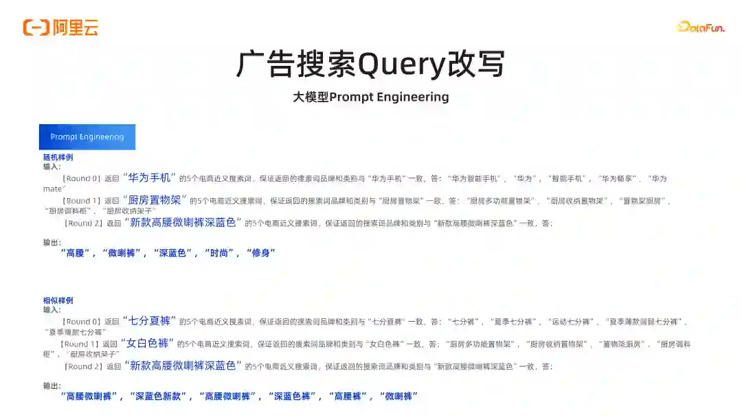 我们在利用 LLM 进行 Prompt Engineering 时做了一些尝试。LLM 具有举一反三的能力,可以告诉 LLM 一个词,然后生成几个相关的词。例如,返回“华为手机”5 个电商近义词,保证搜索词品牌和类别与“华为手机”一致,LLM 可以生成“华为智能手机”、“华为”、“智能手机”、“华为畅享”、“华为 Mate”。再如,返回“新款高腰微喇裤深蓝色”5 个电商近义词,LLM 输出“高腰”、“微喇裤”、“深蓝色”、“时尚”、“修身”。一种更好的方法是使用同类目、同方向的相似 query 引导模型输出。例如,把前两个 query“华为手机”与“厨房置物架”替换成“七分夏裤”与“女白色裤”,引导LLM 输出第三个 query,生成的“高腰微喇裤”、“深蓝色新款”、“深蓝色裤”、“高腰裤”、“微喇裤”更贴近实际需求。这种方法在实际使用中效果更好,能快速应用于日常工作。
