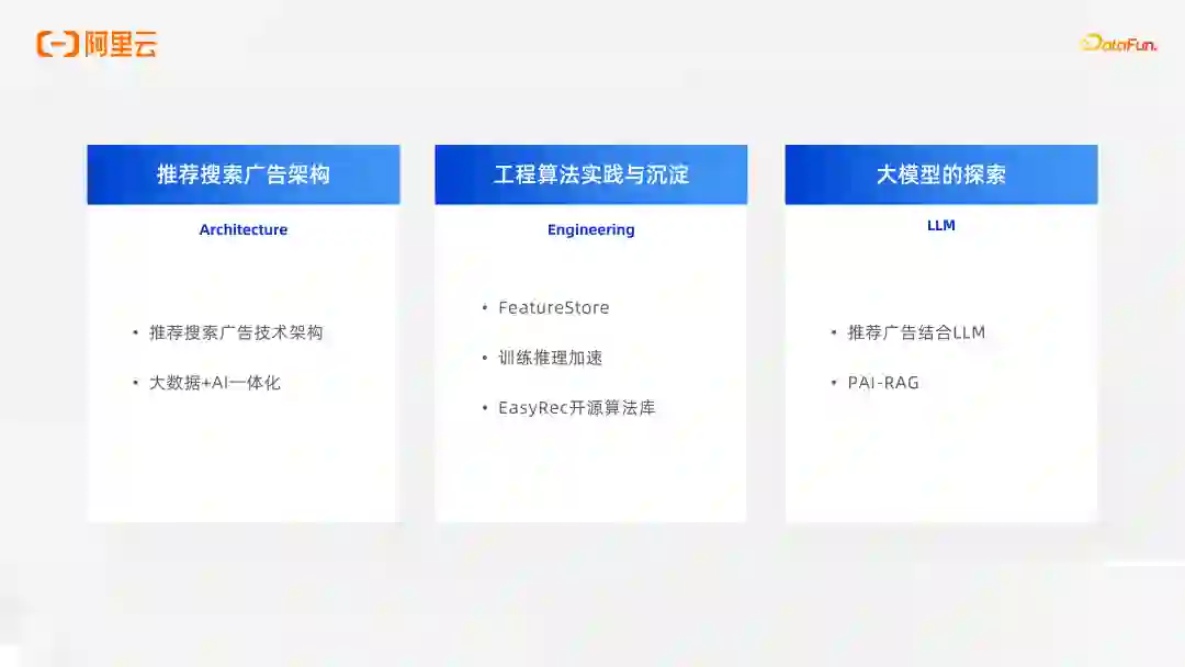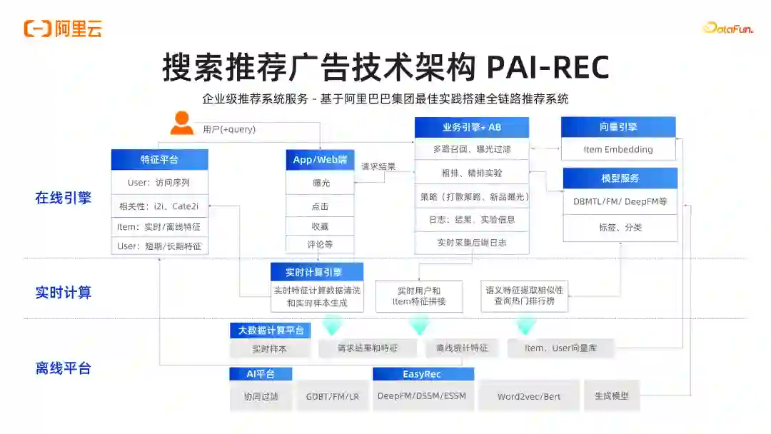 今天介绍从大数据到大模型过程中,我们的大数据平台建设,以及如何在大数据场景下应用大模型的能力。分享内容分为三大块:一是搜索推荐广告的技术架构;二是在搜索推荐场景中的工程和算法实践;三是结合大模型的一些探索及相关工程产出。 分享嘉宾|施兴 阿里云 阿里云人工智能平台-PAI产品架构负责人 编辑整理|王甲君 内容校对|李瑶 出品社区|DataFun