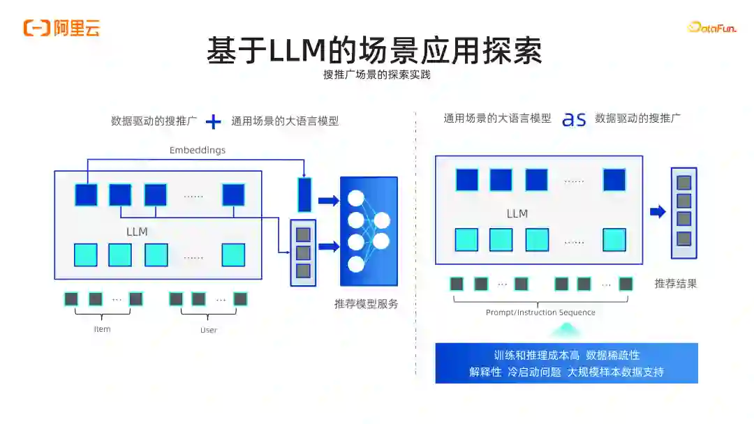 业界通常有两种处理方式。左边这种是将推荐场景与大语言模型(LLM)结合,利用 LLM 丰富的知识表达,将其 embedding 作为特征进行融合,然后进行在线模型服务。右边是直接使用 LLM,将专业领域数据输入 LLM,让其进行推荐。这包括直接对大模型进行 fine-tuning,以及 RAG 场景。然而,直接使用 LLM 进行推荐搜索,会带来较高的训练推理成本,同时还需要解决数据稀疏和冷启动问题。因此,当前主流方法还是上图中左边这种。