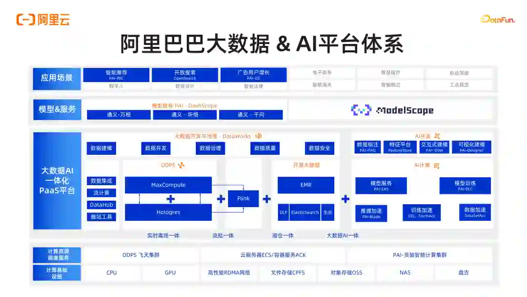 为了支持复杂的推荐链路,阿里云的技术架构如下:最底层是资源层,包含 CPU、GPU 等各类硬件。通过集群调度能力,把算力往外输出,例如 ODPS 飞天集群,阿里云的容器化服务,以及灵骏智能计算集群。灵骏智能计算集群主要面向大模型时代,满足高性能算力需求。底层有大量高性能的异构计算资源,如众所周知的 GPU,包括英伟达以及其他厂家提供的 GPU。还有高性能网络来支撑,因为大模型训练需要几千张卡,这就需要保证卡之间的通信是高带宽低延时,因此需要高性能 RDMA 网络。另外,为了快速读取样本,还需要高性能的存储,否则就会浪费大量 GPU。这就是我们最底层的资源调度层,再上一层是“大数据+ AI”一体化的 PaaS 平台。