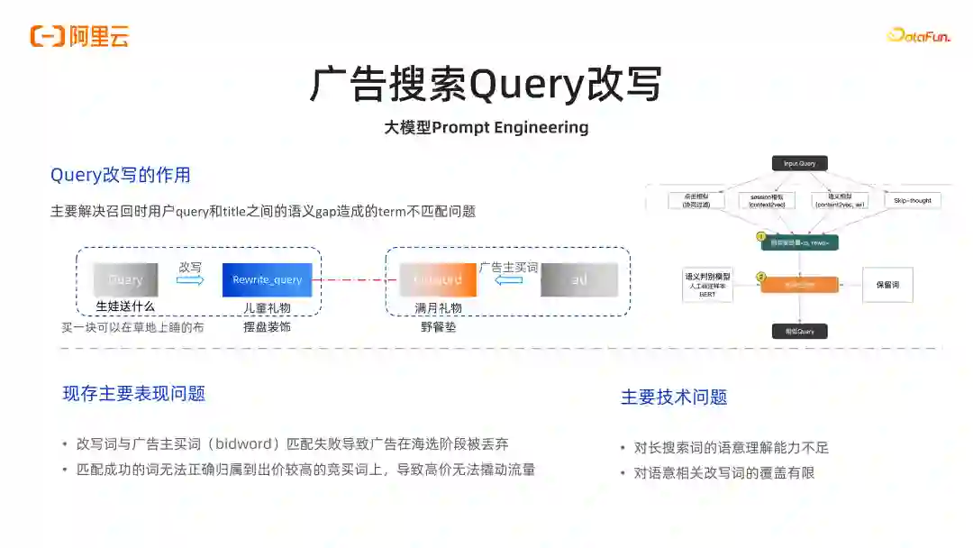 第二个应用场景是广告搜索中的 query 改写。例如,对于 query“生娃送什么”,直接搜索难以找到具体商品,传统的 query 改写会将其改写为“儿童礼物”。而对于“买一块可以在草地上铺的布”,被误解为“摆盘装饰”。这就是广告组买关键词时遇到的问题,如“满月礼物”或“野餐垫”。query 改写效果不好会导致两个主要问题。一是改写后的 query 匹配不到广告主的关键词,导致在召回阶段就被淘汰。二是无法匹配到高价流量的精确需求,会浪费部分高价流量。比如,广告主买了“儿童礼物”,但实际搜索的是“满月礼物”。这些问题背后的主要技术原因是,传统的方法对于长搜索词的语义理解能力有限,且在语义相关的改写词覆盖上也比较有限。