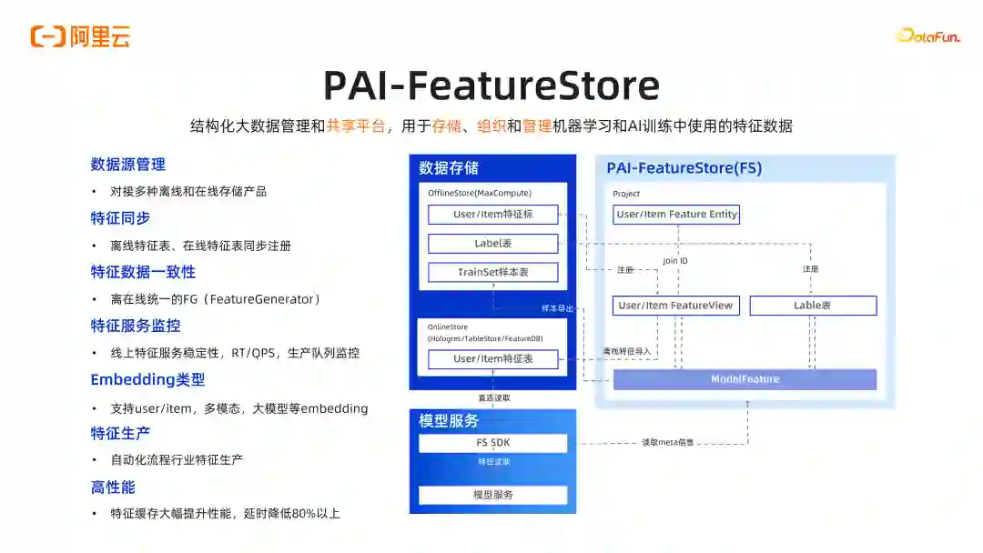 特征平台(FeatureStore)是一个结构化大数据管理和共享平台,用于存储、组织、管理机器学习和 AI 训练中使用的特征数据。传统上,每个算法工程师处理自己的特征表,没有一个统一的平台来共享这些特征。而 FeatureStore 平台支持数据从离线平台如 Hadoop 的 HDFS 和 MaxCompute 同步到 Hologres、TableStore、FeatureDB 等一些在线平台,并保证数据一致性。在推荐搜索算法开发中,经常会遇到离线训练模型效果好,但在线服务时效果不一致的问题。为此,我们通过云上推荐解决方案型产品 PAI-REC,保证了数据的离线和在线一致性。另外,线上特征服务也保证了稳定性,并添加了生产队列监控,如实时监控 RT/QPS 变化,以及实时特征的写入请求队列是否存在风险和堆积等。在大模型(多模态)时代,Embedding 特征是必不可少的,如搜索推荐的 user/item 特征,这些特征可以在 FeatureStore 平台统一管理。有了这些原始特征,需要思考如何高效开发特征生产工作。因此,我们开发了一些基础的特征生产功能,便于特征的二次加工和生成更多的特征。在性能上,FeatureStore 平台是为了模型推理时能在线上直接提供特征访问服务。但在某些情况下,如搜索推广场景,整个端到端的请求需要在一两百毫秒内完成,如果跨网络获取特征会导致延时,因此需要在每个环节都做到极致。为了加速特征获取的速度,我们采取了一个优化策略,即预先将数据拉到本地,利用本地内存换取时间。这也是大家在日常工作中可以参考的一个优化点。具体的流程如右边的图所示,这里就不详细展开了。