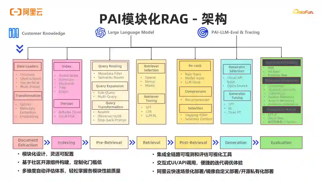 开源项目 PAI-RAG 将 RAG 链路过程中的各个环节进行模块化设计。整体过程抽象成文档抽取(Document Extraction)、索引建立(Indexing)、Pre-Retrieval(query 改写在此阶段)、Retrieval、Post-Retrieval、Generation、Evaluation 等。如何排序检索出来的结果,如何让有效的文档排在前面,或者对所有检索出的文档进行总结,以更有效地引导 LLM 生成,最后再进行评估,形成一个完整的 RAG 链路流程。我们目前的主要工作是使 RAG 工程链路变得更方便适配各种场景。比如,如果数据不是 PDF 或 Word,而是 PPT,能很方便添加读取 PPT 文件的功能。对于 Query React,可以轻松地进行二次开发加工等。