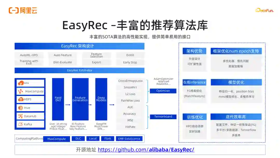 在推荐搜索算法中,我们发现每个客户会实现一些如 DeepFM 的经典算法。然而,这意味着每个客户需要一套自己的 DeepFM 代码,这增加了开发工作量。因此,我们建立了 EasyRec 推荐算法库,方便开发人员使用不同的计算资源,如 MaxCompute、Hadoop、Spark 等,甚至可以在本地设备上运行。EasyRec 支持多种数据源,如阿里云的 OSS、MaxCompute 或者 HDFS、Hive 等;还提供了 FeatureGenerator 功能,只要配置文件一样,能确保离线训练和在线推理的计算逻辑一致,避免引入误差。EasyRec 集成了针对实际应用场景的有效算法;EasyRec 还支持自动调参(AutoML-HPO)、特征自动生成(Auto Feature)、特征自动选择(Feature Selection)、模型蒸馏(Distill)、训练加速优化、离线评估以及 Early Stop 等功能,帮助算法工程师减少开发工作量。