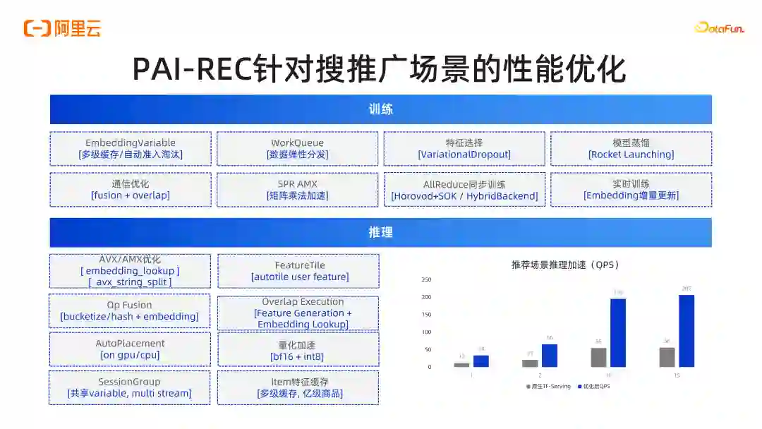 在搜索推荐广告场景下,我们对训练和推理进行了两大方向的优化。在训练优化上,①多级缓存和特征自动淘汰:引入特征的自动准入和淘汰机制,实时或离线训练中低频度特征会被淘汰,减少计算资源和显存的占用。②WorkQueue 模式:将训练数据变成队列,解决不同服务器和显卡处理速度不一致的问题,通过生产者-消费者模式提高计算效率。③特征选择与知识蒸馏:优化特征和模型结构。④通信优化:通过单机融合和流水并行减少通信量,提升效率。⑤硬件加速:与阿里云、英特尔、英伟达合作,使用 AVX/AMX 矩阵加速、AllReduce 同步训练、SOK 合作以及 Embedding 增量更新,进行实时增量模型训练。在推理优化上,①AVX/AMX 加速:在 CPU 上加速 embedding_lookup 和 string_split。②量化加速:在 GPU 上引入 bf16+int8 量化,减少计算耗时。③AutoPlacement:在 CPU 和 GPU 之间自动高效地分配算子。④SessionGroup:利用 GPU 的 multi stream 特性加速计算。⑤特征缓存:针对推荐场景进行特征缓存优化。我们在电商场景的真实客户中,通过这些优化使 QPS 提升到原生 TF-Serving 的四倍左右。