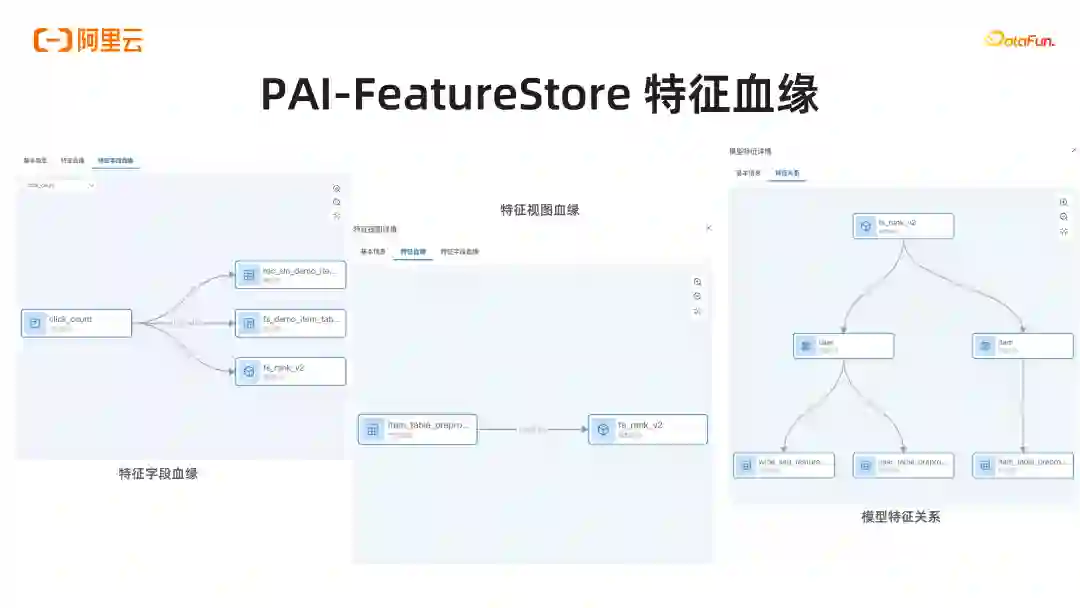 FeatureStore 平台还支持特征血缘功能。在分析特征时,如果算法工程师发现特征存在问题,需要知道该特征是从哪些源表生成,以及被谁使用。这种血缘关系在结构化数据中极为关键,如果最后的结果出错,需要找出问题所在。这需要数据工程师或算法工程师投入大量精力去追踪。而有了血缘图,我们可以一眼就看出该字段是从哪些表中来,又被用在哪里,以及最后服务于哪些模型,这就是特征血缘功能的作用。