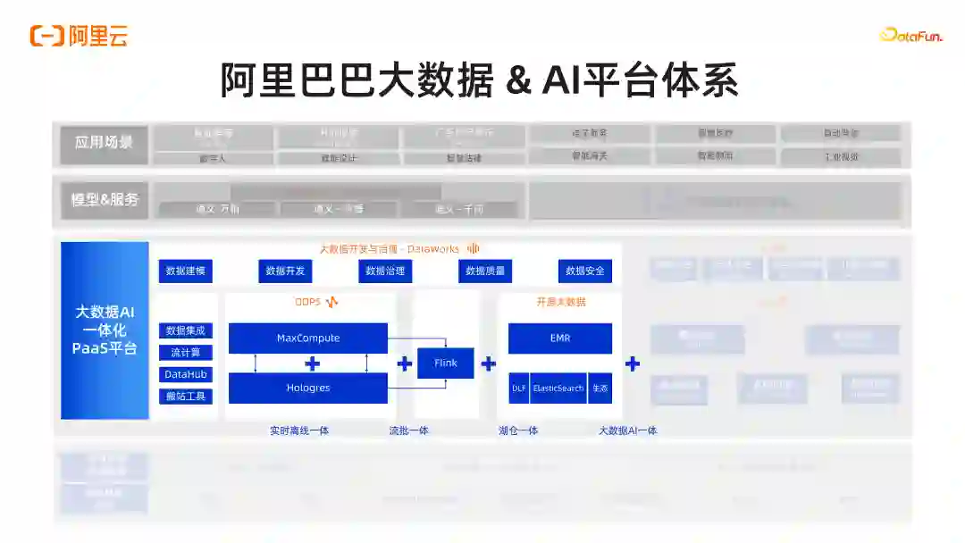 大数据和 AI 的 PaaS 平台主要分为几部分:实时和离线一体化的大数据平台,包括 MaxCompute 和 Hologres。MaxCompute 对标开源的 Hadoop,而 Hologre 可以简单理解为类似 Redis 的实时 OLAP 分析工具。Flink 用于实时计算流,EMR(Elastic MapReduce)则是阿里云上对标的开源大数据平台。