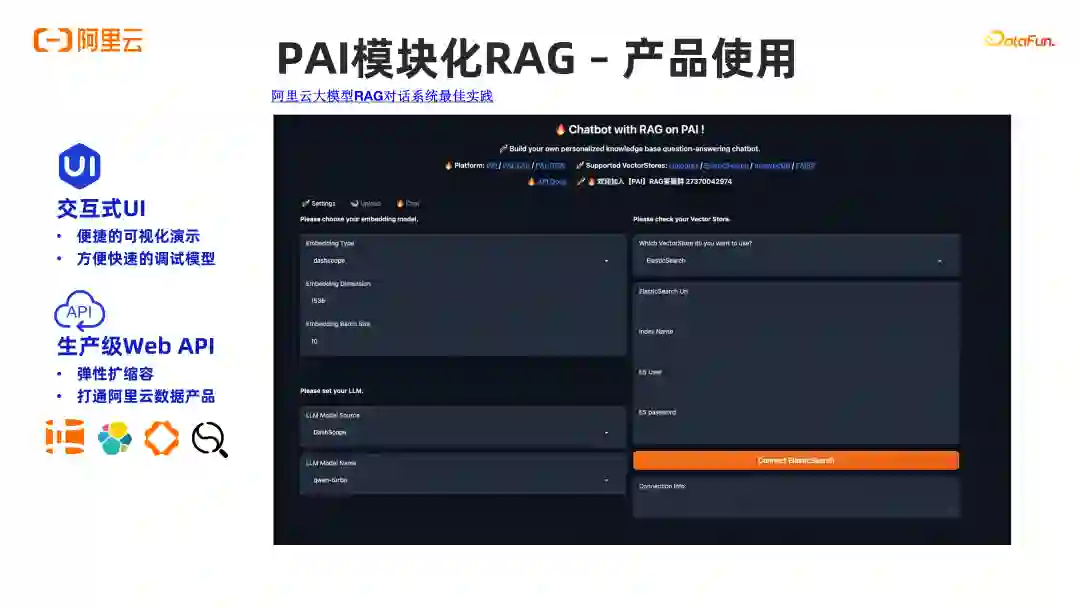 这是我们在 PAI 模块化 RAG 中的一个示例图,并使用 Gradio 编写的前端,使得配置 RAG 链路和上传数据变得非常方便,还可以直接进行交互测试。以上就是本次分享的内容,谢谢大家。
