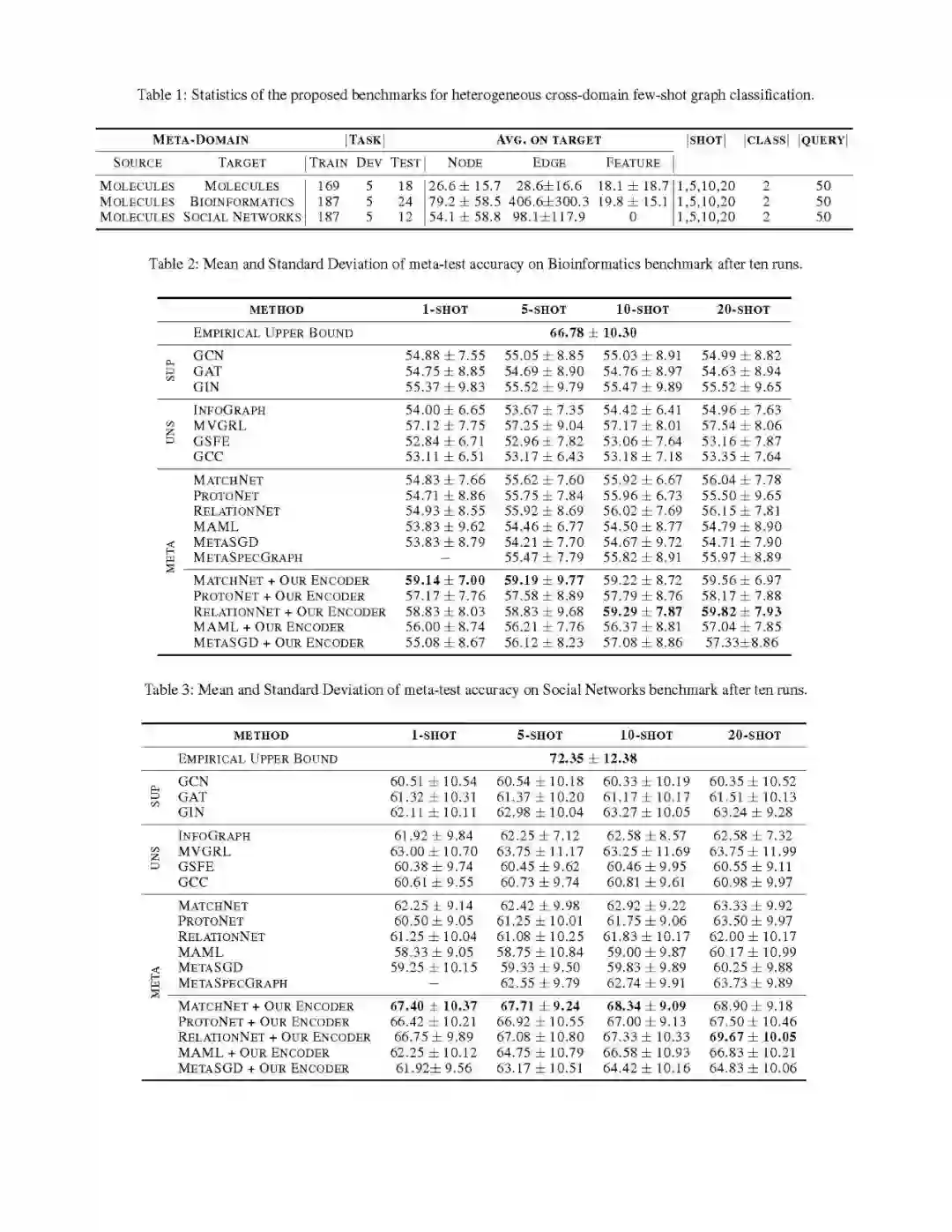 结果表明: (1)在这三个基准上,都存在可迁移的潜在知识。实验结果证实通过观察元学习和对比方法都优于单纯分类器。(2) 对比方法与元学习方法相比具有更强的性能。例如,在20-shot生物信息学基准测试中,MVGRL的绝对准确度比最佳的元学习方法高出1.57%。(3) 将基于度量的元学习方法与我们提出的编码器相结合,显著提高了性能。例如,在单次测试的情况下,最佳元学习方法结合我们的编码器,在分子、生物信息学和社交网络基准上的绝对精度分别比常规元学习方法的最佳结果高出3.28%、4.29%和5.17%。(4)与我们的编码器相结合,仅用20个例子训练的RelationNet模型,与全监督模型在所有可用的分子数据、生物信息学和社会网络基准上训练的模型相比,准确率分别只有4.46%、6.96%和2.68%。注意,其中一些数据集有成千上万个训练样本。(5) 当我们将知识从分子元训练迁移到社会网络元测试时,我们得到了最大的改进。这是因为社会网络任务不包含任何初始节点特征,因此对它们进行分类完全依赖于任务不可知的几何特征。这表明我们的编码器能够在一个领域学习表达几何表示并泛化到另一个领域。