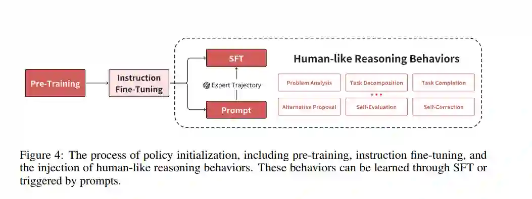 如图4所示,LLMs的初始化过程主要包括两个阶段:预训练和指令微调。在预训练阶段,模型通过在大规模网络语料库上进行自监督学习来发展基础的语言理解能力(Sun等,2024d;Weber等,2024;Liu等,2024f),并遵循计算资源与性能之间已知的幂律关系(Kaplan等,2020;Hoffmann等,2022)。随后,指令微调将LLMs从简单的下一个令牌预测转变为生成符合人类意图的响应(Wei等,2022a;Chung等,2024)。对于像o1这样的模型,结合类人推理行为是至关重要的,它能够使模型更深入地探索解答空间。我们总结了通过提示或通过专家轨迹蒸馏从LLMs中激活的六个关键行为。