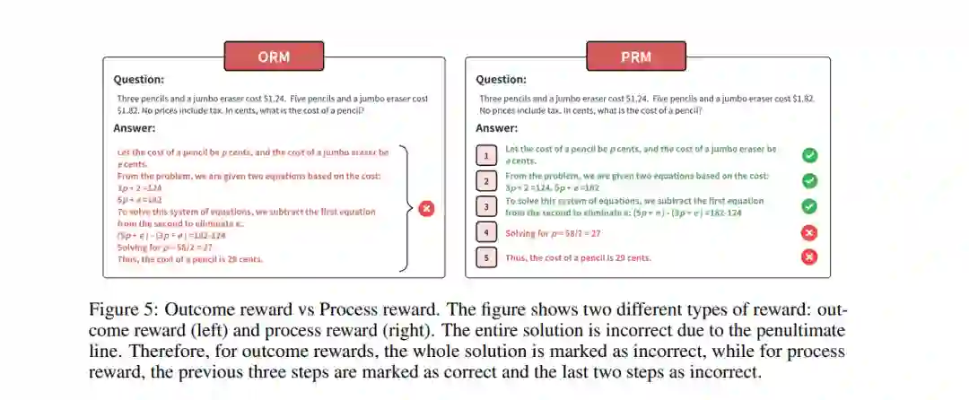 在强化学习中,智能体通过从环境中接收奖励信号来获得反馈,并通过改进策略来最大化长期奖励。奖励函数,记作 r(st, at),表示智能体在时间步 t 的状态 st 下采取动作 at 时所获得的奖励。奖励信号在引导训练和推理过程方面至关重要,因为它通过数值评分定义了智能体的期望行为。虽然可以从不同的奖励设计中学习到相同的最优策略(Ng 等,1999),但一个设计良好的奖励信号可以加速学习的收敛过程以及搜索过程的效率。 本节概述了当前针对大规模语言模型(LLMs)的奖励设计方法。我们首先比较了结果奖励和过程奖励。接着,我们介绍了专门为 LLM 提出的奖励设计方法。我们还回顾了在强化学习中广泛应用的奖励设计技术,这些方法尚未在 LLM 中得到应用。最后,基于对这些不同方法的比较,我们提供了一些关于 o1 奖励设计的推测性讨论。 5 搜索