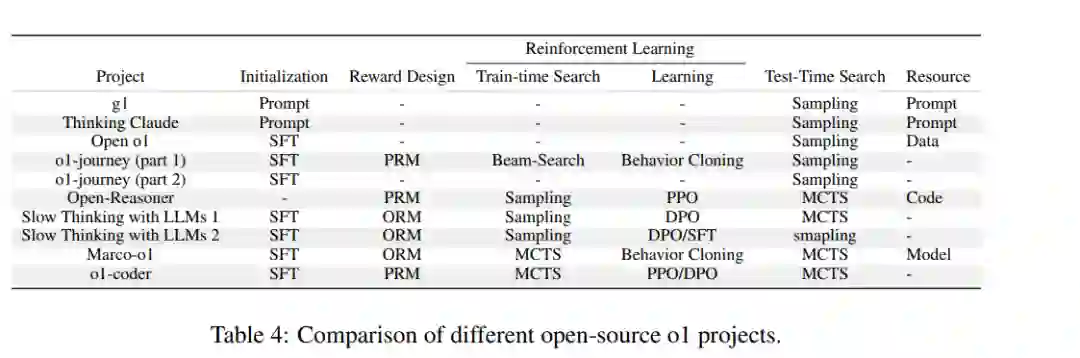 尽管 o1 尚未发布技术报告,但学术界已经公开了多个 o1 的开源实现。所有这些实现都可以视为本文介绍的 o1 框架的组成部分或特定情况。在表4中,我们总结了这些开源项目在政策初始化、奖励设计、搜索和学习方面采用的方法。 此外,还有一些来自工业界的类似 o1 的模型,例如 k0-math、skywork-o1(o1 Team,2024)、Deepseek-R1(Shao 等,2024)、QwQ(Team,2024)和 InternThinker(Cai 等,2024)。我们不讨论这些模型,因为它们尚未公开其技术。
