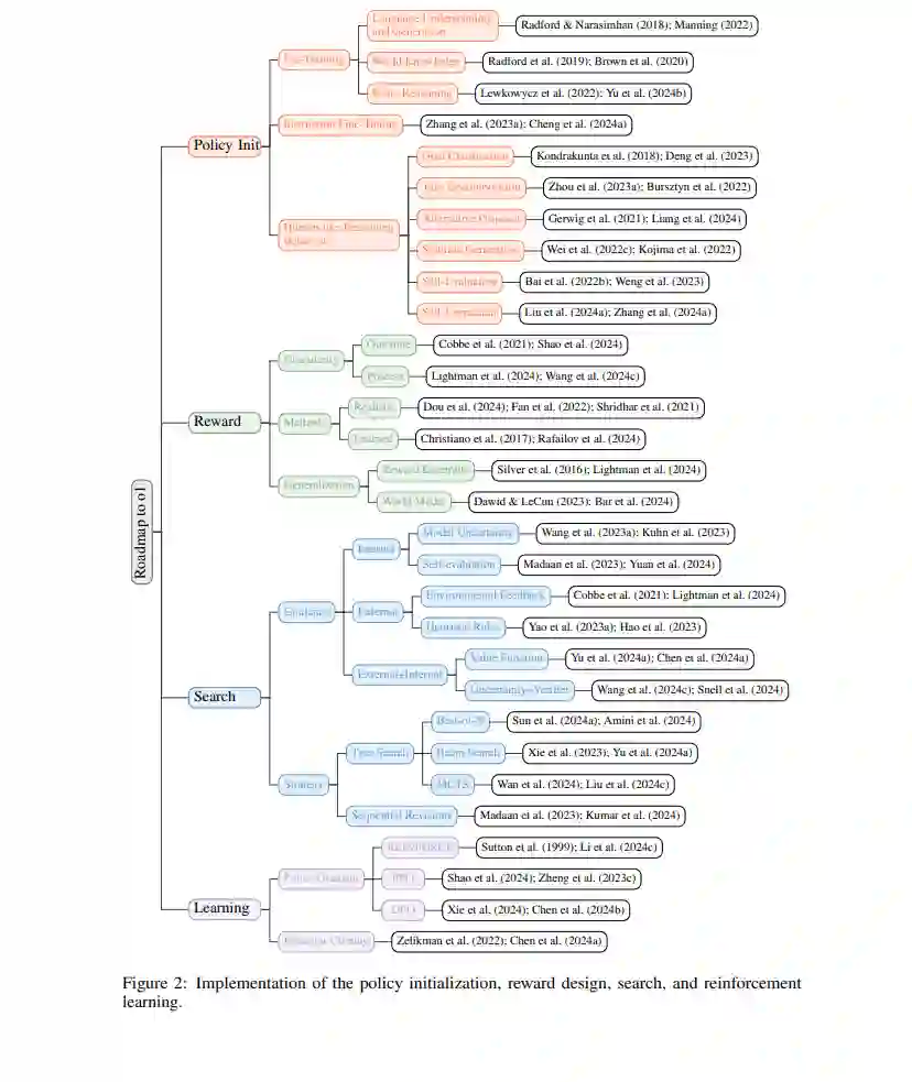 我们将详细探讨策略初始化(第3节)、奖励设计(第4节)、搜索(第5节)和学习(第6节)的潜在实现。此外,我们还回顾了现有的开源o1项目,展示了它们如何作为我们框架的组成部分或特定实例(第7节)。最后,我们讨论了o1的未来发展趋势和相关挑战(第8节)。