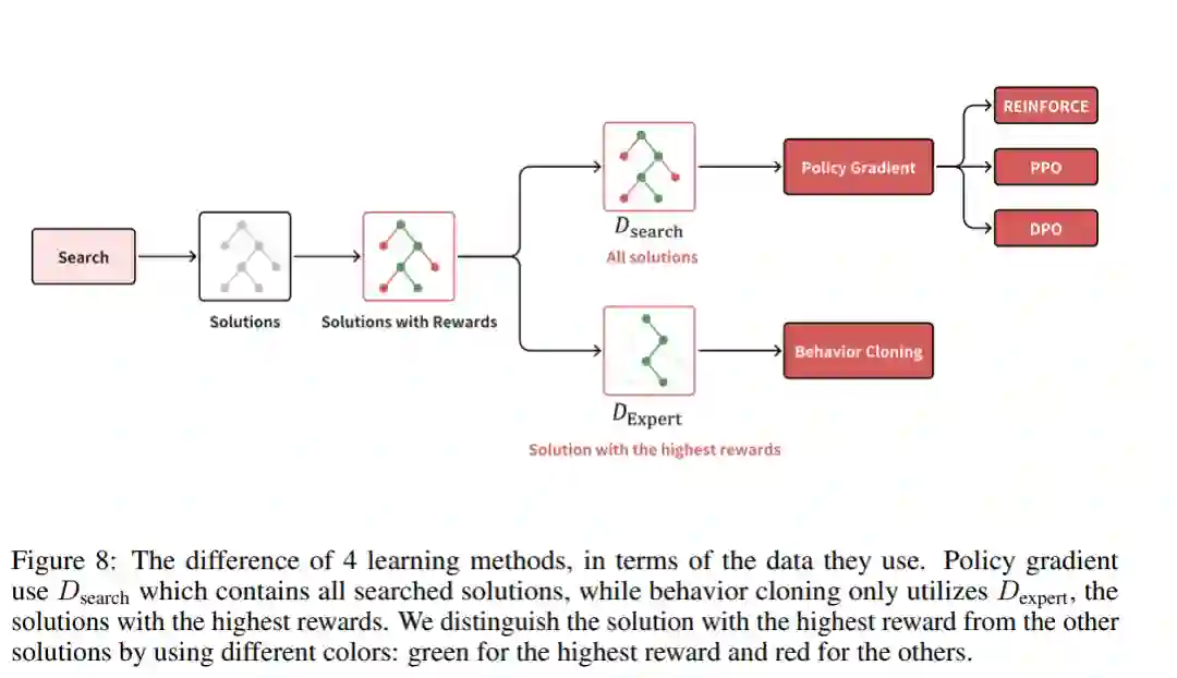 对于大规模语言模型(LLMs),在生成过程中进行随机采样已成为提高输出质量的主流方法,其中像核采样(nucleus sampling)等技术是显著的例子(Holtzman 等,2020)。此外,许多研究(Kulal 等,2019;Chen 等,2021)观察到,随着模型样本数量的增加,pass@k指标不断提高。Brown 等(2024)显示,即使是小型模型也能通过利用搜索超过大型模型的性能。这表明,语言模型通过在推理过程中更多地进行采样,具有探索正确解决方案的潜力,这需要消耗更多的推理时间计算。搜索是指通过多次尝试或基于某些指导(如奖励或启发式规则)进行战略性探索,从而找到正确解决方案的过程。诸如自一致性(self-consistency)(Wang 等,2023a)和最佳N(Best-of-N, BoN)(Cobbe 等,2021)等推理策略都可以视为搜索方法。对于像 o1 这样的模型,它们被设计用来解决复杂的推理任务,搜索可能在训练和推理过程中都发挥重要作用。在本节中,我们首先分析搜索在 o1 中可能扮演的角色,然后介绍几种有前景的搜索方法的细节,这些方法有可能在构建 o1 类模型时发挥作用。 6 学习 我们已经介绍了策略初始化,模型通过从人类专家数据中学习。那么,为什么我们仍然需要强化学习呢?强化学习之所以至关重要,是因为其训练数据是无限的,来源于与环境的互动。相反,人类专家数据是有限且昂贵的。此外,强化学习具有实现超人类表现的潜力,因为它通过试错学习,而不是依赖于人类专家数据。虽然人类专家数据捕捉了人类的行为和知识,强化学习则能发现人类可能无法想到的策略。例如,利用强化学习的AlphaGo(Silver 等,2016)通过发现之前专家未曾知道的新策略,在围棋比赛中击败了世界级人类选手,著名的“37手”就是AlphaGo发现的新策略之一(Silver 等,2016)。 强化学习通常使用策略采样轨迹,并根据接收到的奖励来改进策略。在o1的上下文中,我们假设强化学习过程通过搜索算法生成轨迹,而不仅仅依赖于采样。搜索方法的一个优势是它们能够探索比随机采样更优的状态或解决方案。例如,束搜索(beam search)优先选择具有最高期望动作值的动作。因此,搜索技术可以提供比简单采样更高质量的训练数据。在这一假设下,o1的强化学习可能涉及一个搜索和学习的迭代过程。在每次迭代中,学习阶段利用搜索生成的输出作为训练数据来增强策略,而改进后的策略将在下一次迭代中应用于搜索过程。一个典型的搜索与学习迭代的例子是AlphaGo Zero(Silver 等,2017),它使用通过蒙特卡洛树搜索(MCTS)获得的轨迹数据进行策略学习。 训练时的搜索不同于测试时的搜索。测试时的搜索输出所有候选解决方案中具有最大奖励或信心的解决方案。但在训练时,所有通过搜索生成的候选解决方案都可以被学习所利用。我们将通过搜索输出的状态-动作对集称为 Dsearch,而搜索中最优解决方案中的状态-动作对集称为 Dexpert。因此,Dexpert 是 Dsearch 的一个子集。我们在图8中可视化了 Dsearch 和 Dexpert 之间的差异。