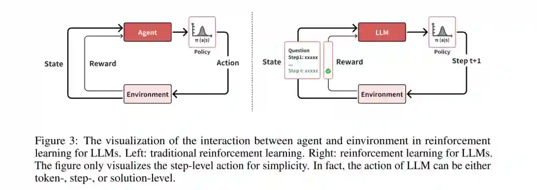 由于本路线图是从强化学习的角度设计的,因此本节将介绍强化学习的背景及其与大规模语言模型(LLM)的关系。与其他学习范式不同,强化学习通过与环境的交互进行学习,而不是从静态的训练数据集中进行学习。在强化学习中,智能体通过探索环境并从中获得奖励来进行学习。图3展示了强化学习中智能体与环境之间的交互,特别是在大规模语言模型(LLM)中的应用。