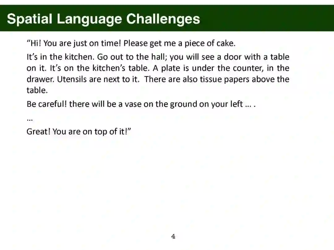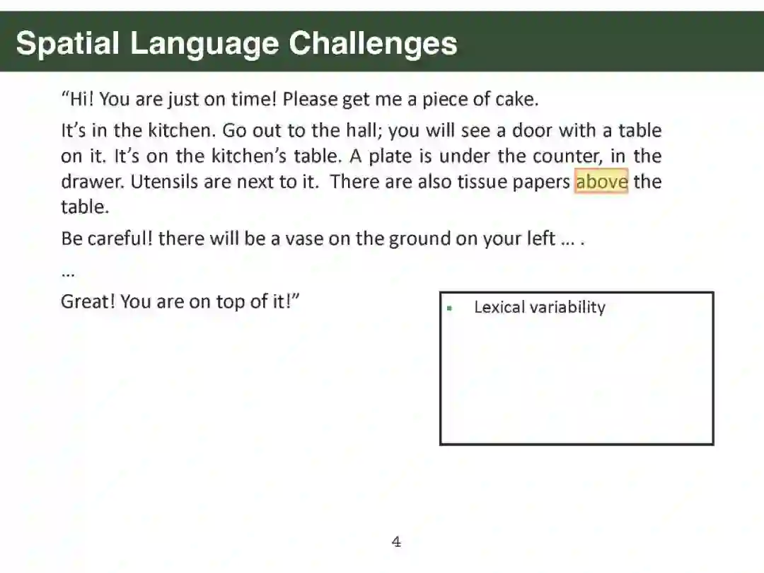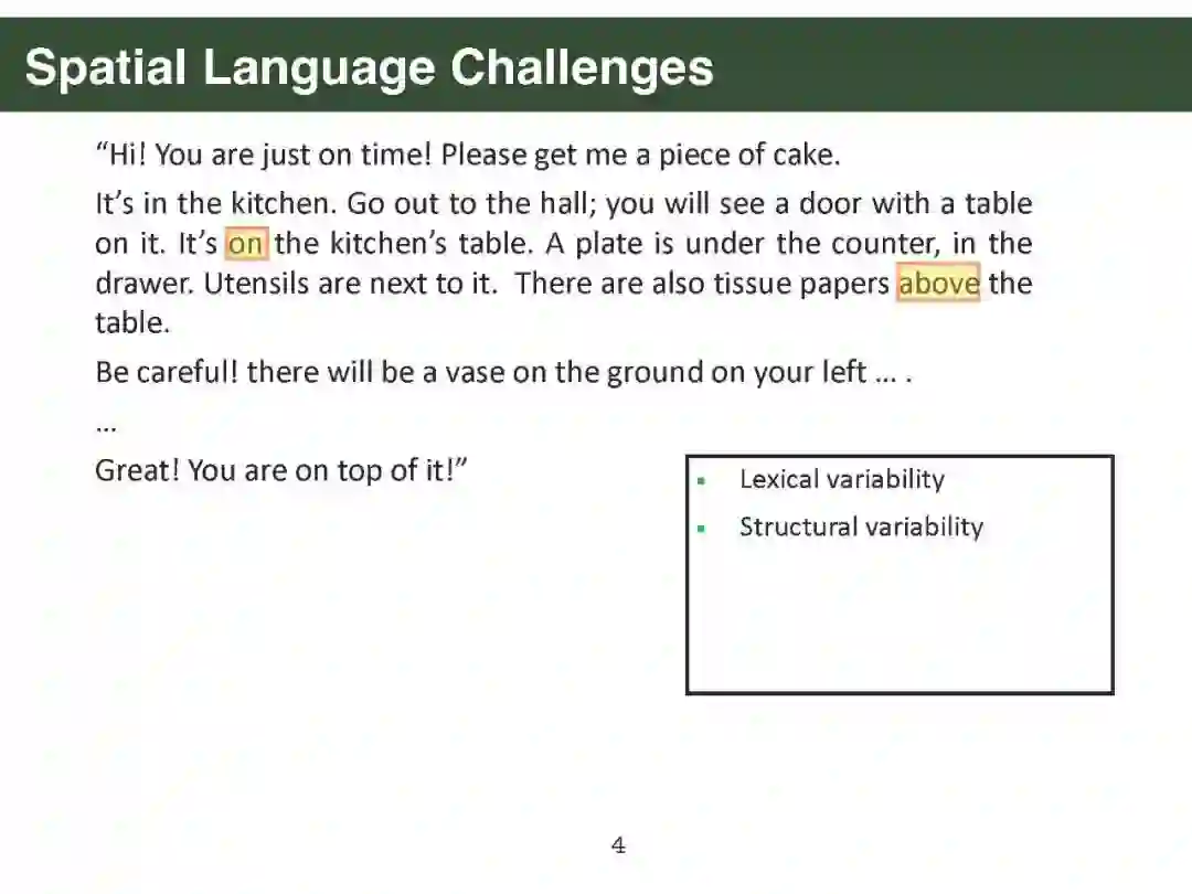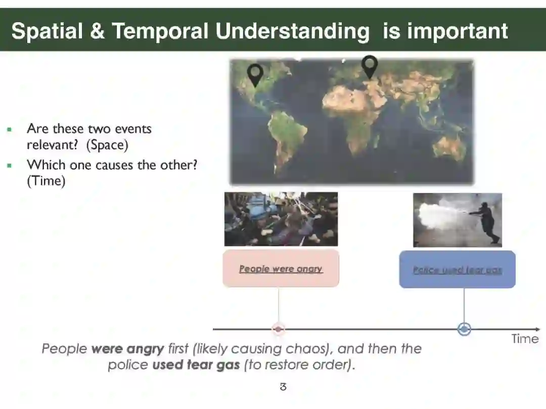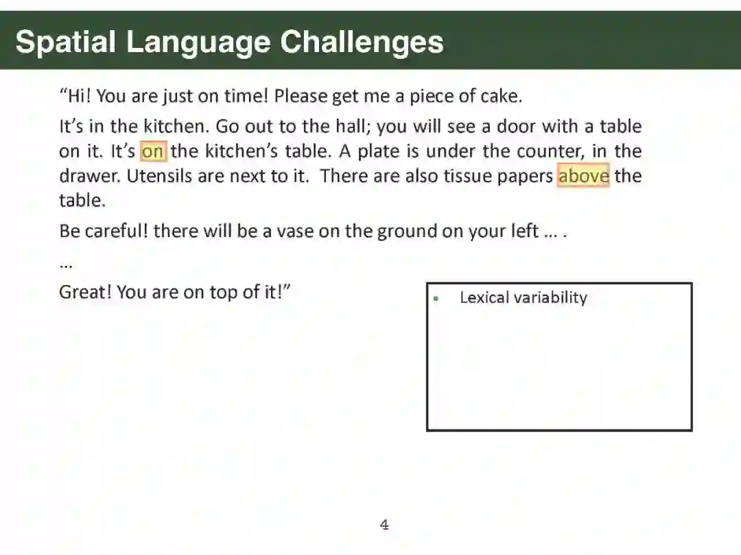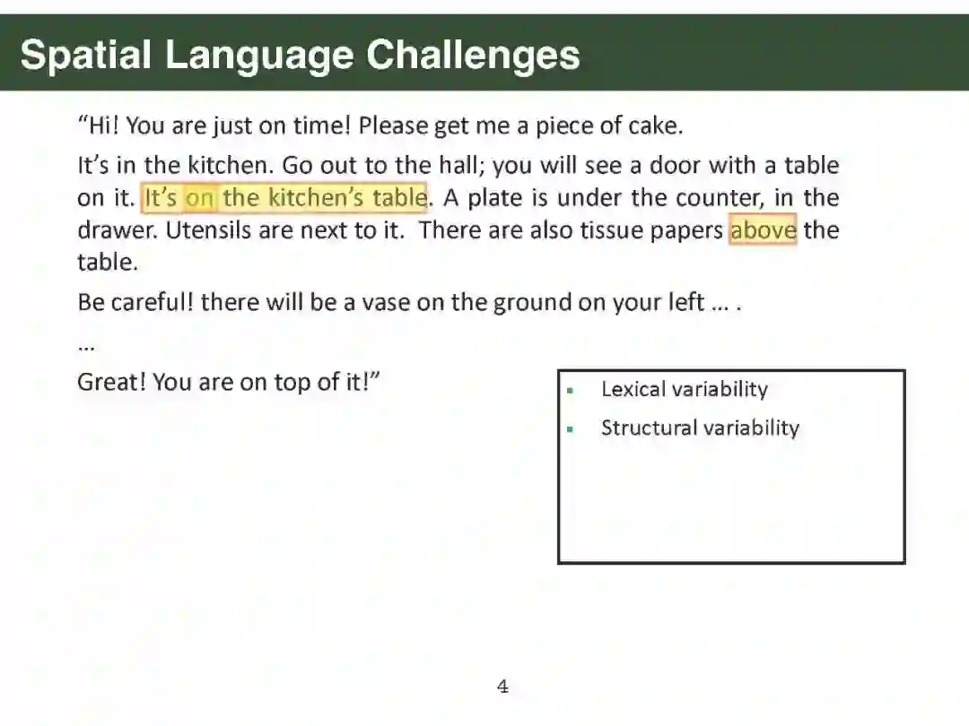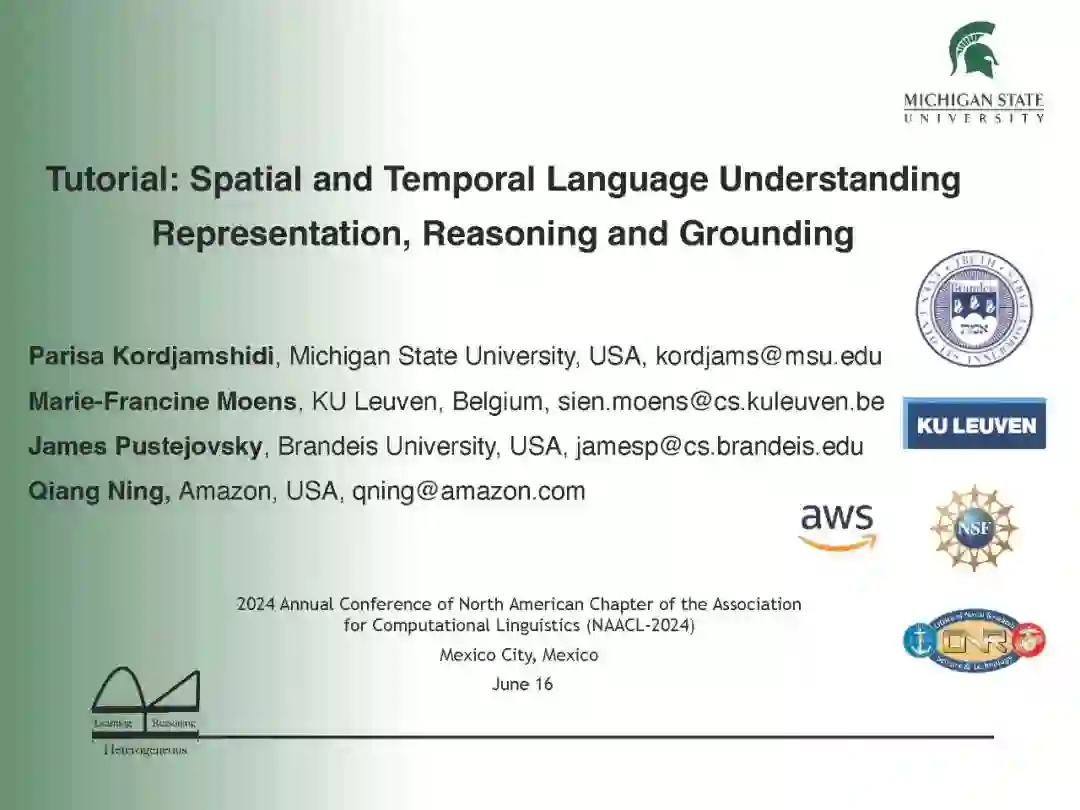 幻灯片内容: 第一部分. Parisa Kordjamshidi [PDF]: 简介:挑战和动机 空间标注方案 空间信息抽取 文本中的空间推理:空间问答 视觉和语言中的空间推理 下游应用:导航 第二部分. Qiang Ning [PDF]: 时间标注方案 时间信息抽取 时间推理:时间问答 下游应用:机器人路径规划 第三部分. Sien Moens [PDF]: 大规模语言模型的空间常识 将语言投射到物理坐标(空间) 将事件投射到一维时间轴(时间) 第四部分. James Pustejovsky [PDF]: 使用AMR和GLAMR进行空间推理 情境落地:人与物体的互动等 密集释义 - 数据增强、情境化、蕴涵 视觉语言动作模型 第五部分. Parisa Kordjamshidi [PDF]: 结论
