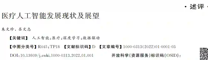 人工智能(artificialintelligence,AI)赋能医疗,通 过提升临床诊疗效率和服务质量,缓解医疗卫生资源 短缺和不均衡等问题[1G3].医疗机构、科研院所和企业 多方联合攻坚,希望借鉴 AI在翻译、金融和安防等领 域的成功经验,实现医疗领域的重大变革[1].本文拟 梳理医疗 AI的发展历程,探讨目前存在的挑战及未 来发展方向.
