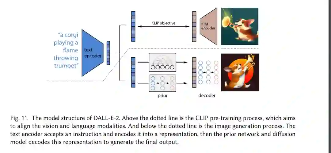 生成模型在不同领域的发展遵循不同的路径,但最终出现了交叉的问题:transformer架构[32]。Vaswani等人在2017年引入了NLP任务,Transformer后来被应用于CV中,然后成为不同领域许多生成模型的主要骨干[9,33,34]。在NLP领域,许多著名的大型语言模型,如BERT和GPT,采用transformer架构作为其主要的构建块,比之前的构建块(如LSTM和GRU)具有优势。在CV中,Vision Transformer (ViT)[35]和Swin Transformer[36]后来通过将Transformer架构与视觉组件相结合,进一步发展了这一概念,使其可以应用于基于图像的下游。除了transformer给单个模态带来的改进之外,这种交叉还使来自不同领域的模型能够融合在一起,以完成多模态任务。多模态模型的一个例子是CLIP[37]。CLIP是一种视觉-语言联合模型,将transformer架构与视觉组件相结合,允许它在大量文本和图像数据上进行训练。由于它在预训练时结合了视觉和语言知识,因此也可以作为多模态提示生成中的图像编码器。总而言之,基于transformer的模型的出现彻底改变了人工智能的产生,并导致了大规模训练的可能性。