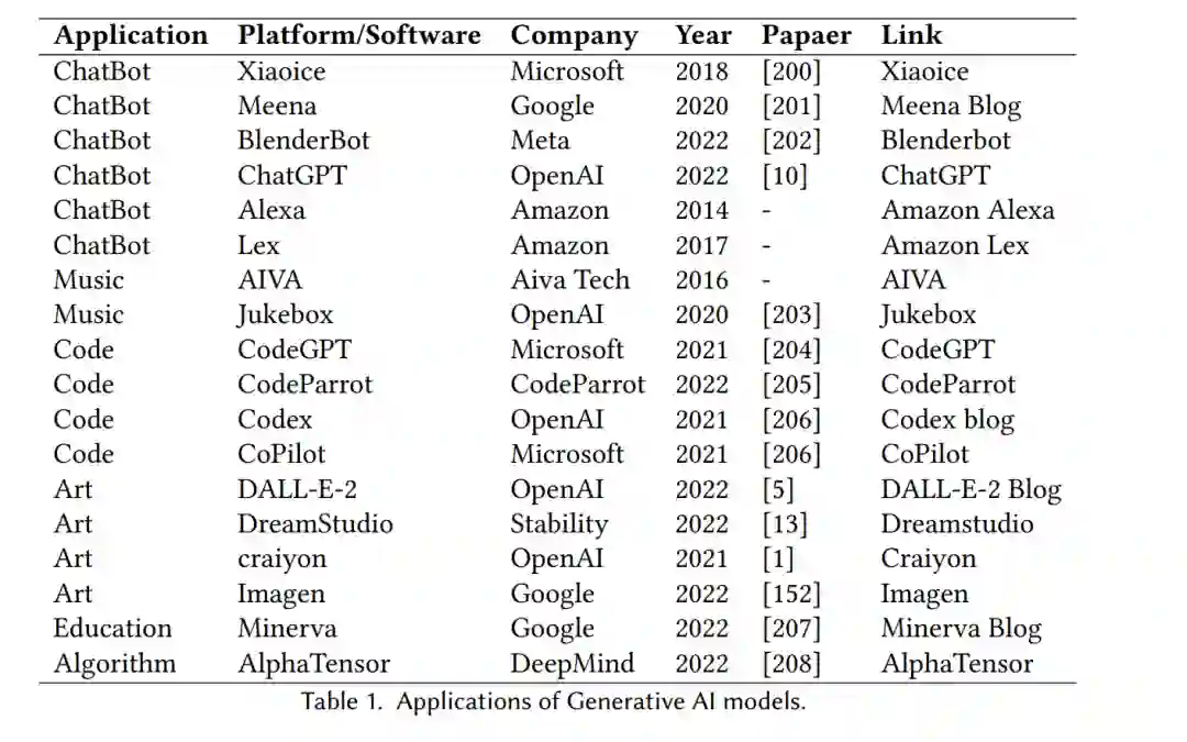 调研的其余部分组织如下。第二节主要从视觉模态和语言模态两个方面回顾了AIGC的历史。第3节介绍了目前在GAI模型训练中广泛使用的基本组件。第4节总结了GAI模型的最新进展,其中第4.1节从单模态角度回顾了进展,第4.2节从多模态生成的角度回顾了进展。在多模态生成中,介绍了视觉语言模型、文本音频模型、文本图模型和文本代码模型。第5节和第6节介绍了GAI模型在AIGC中的应用以及与该领域相关的一些重要研究。第7、8节揭示了AIGC技术存在的风险、存在的问题和未来的发展方向。最后,我们在9中总结了我们的研究。2. 生成式人工智能的历史生成模型在人工智能领域有着悠久的历史,可以追溯到20世纪50年代,隐马尔可夫模型(HMM)[20]和高斯混合模型(GMMs)[21]的发展。这些模型生成了语音和时间序列等顺序数据。然而,直到深度学习的出现,生成模型才在性能上看到了显著的改进。