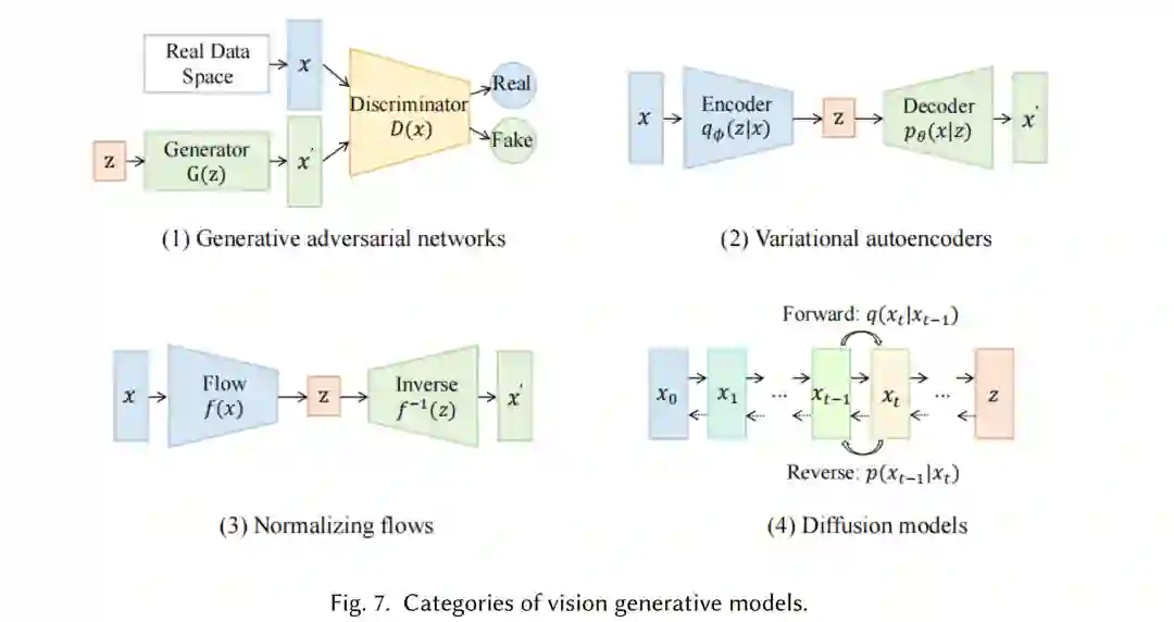 我们将介绍最先进的单模态生成模型。这些模型被设计为接受特定的原始数据模态作为输入,例如文本或图像,然后以与输入相同的模态生成预测。我们将讨论这些模型中使用的一些最有前途的方法和技术,包括生成语言模型,如GPT3[9]、BART[34]、T5[56]和生成视觉模型,如GAN[29]、VAE[30]和归一化流[57]。