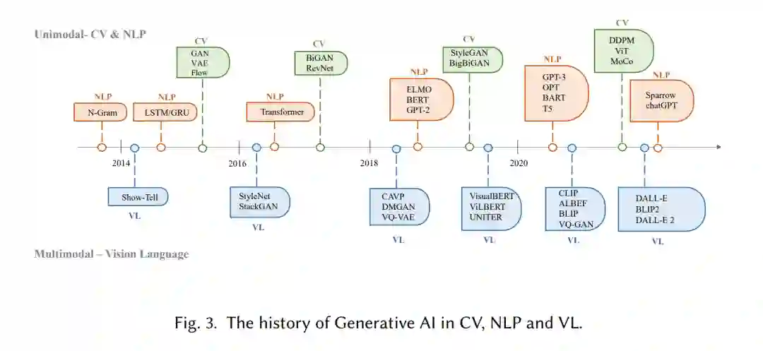 在早期的深度生成模型中,不同的领域通常没有太多的重叠。在自然语言处理(NLP)中,传统的生成句子的方法是使用N-gram语言建模[22]学习单词分布,然后搜索最佳序列。然而,该方法不能有效地适应长句子。为了解决这个问题,循环神经网络(RNN)[23]后来被引入到语言建模任务中,允许对相对较长的依赖关系进行建模。随后,长短期记忆(LSTM)[24]和门控循环单元(GRU)[25]的发育,它们利用门控机制在训练过程中控制记忆。这些方法能够处理样本[26]中的约200个标记,与N-gram语言模型相比,这是一个显著的改进。 同时,在计算机视觉(CV)领域,在基于深度学习的方法出现之前,传统的图像生成算法使用纹理合成[27]和纹理映射[28]等技术。这些算法基于手工设计的特征,在生成复杂多样的图像方面能力有限。2014年,生成对抗网络(Generative Adversarial Networks, GANs)[29]被首次提出,在各种应用中取得了令人印象深刻的结果,是该领域的一个重要里程碑。变分自动编码器(vae)[30]和其他方法,如扩散生成模型[31],也已开发用于对图像生成过程进行更细粒度的控制和生成高质量图像的能力
