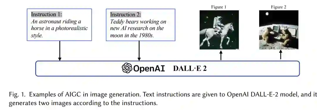 近年来,人工智能生成内容(Artificial Intelligence Generated Content, AIGC)受到了计算机科学界以外的广泛关注,全社会开始关注大型科技公司[3]构建的各种内容生成产品,如ChatGPT[4]和DALL-E2[5]。AIGC指的是使用高级生成AI (GAI)技术生成的内容,而不是由人类作者创建的内容,AIGC可以在短时间内自动创建大量内容。例如,ChatGPT是OpenAI开发的用于构建对话式人工智能系统的语言模型,可以有效地理解并以有意义的方式响应人类的语言输入。此外,DALL-E-2是另一个最先进的GAI模型,也是由OpenAI开发的,它能够在几分钟内从文本描述中创建独特的高质量图像,如图1所示的“一个宇航员以逼真的风格骑马”。随着AIGC的卓越成就,许多人认为这将是人工智能的新时代,并将对整个世界产生重大影响。
