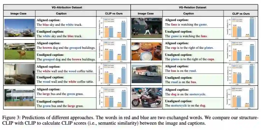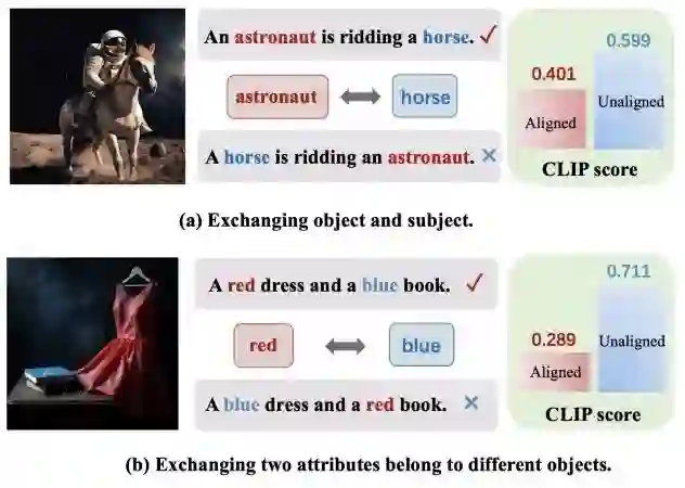 如图(a)所示,我们在分析CLIP模型时发现,与图像不匹配的标题(A horse is riding an astronaut)相比,图像与正确匹配的标题(An astronaut is riding a horse)之间的CLIP分数(即语义相似性)表现出较低的数值。图(b)展示了当交换用来修饰两个对象的属性时,模型在准确区分它们的语义上可能遇到挑战。这些发现表明,CLIP模型产生的通用表征能力无法区分那些包含相同单词但在结构化知识方面存在差异的文本段落。换言之,CLIP模型表现出类似于词袋模型的特点,未能有效理解和捕捉句子中的细粒度语义。