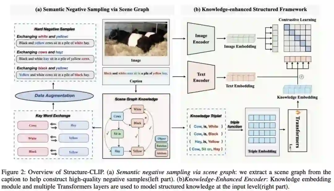 给定一个图像,以及两个图像标题和,其中图像标题与图像内容匹配,而则与图像不匹配。重要的是,这两个文本标题由相同的单词构成,但其单词顺序有所不同。细粒度图文匹配任务的核心目标是在两个高度相似的图像标题中准确识别出与当前图像匹配的标题。具体来说,任务要求模型使得图像与匹配文本的得分高于图像与不匹配文本的得分。 如图所示是我们提出的Structure-CLIP模型的框架图。在该模型中,我们首先利用场景图来生成由相同词汇构成但含有不同细粒度语义的高质量语义负样本,然后通过对比学习的方式来提升细粒度结构化表示的能力(如图左侧所示)。其次,我们设计并实现了一种结构化知识增强的编码器,该编码器以场景图作为输入,并将结构化知识融入到结构化表示中(如图右侧所示),从而实现了结构化信息向文本信息的有效知识迁移。