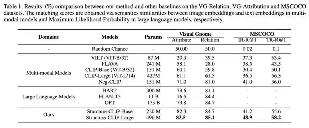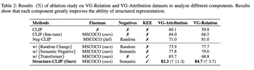 我们探索了三种不同的三元组嵌入方法,以有效整合三元组信息。相比之下,我们提出的三元组嵌入方法既考虑了元素的位置,又综合了它们的组合信息。我们的Structure-CLIP模型在捕捉句子中的细粒度语义信息方面表现出更强的能力,并显著增强了多模态结构化表示的性能。