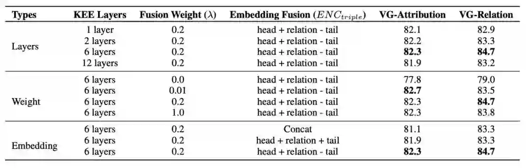 我们对Structure-CLIP在不同超参数和嵌入方法下进行了消融实验。