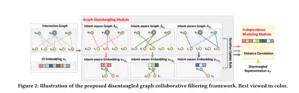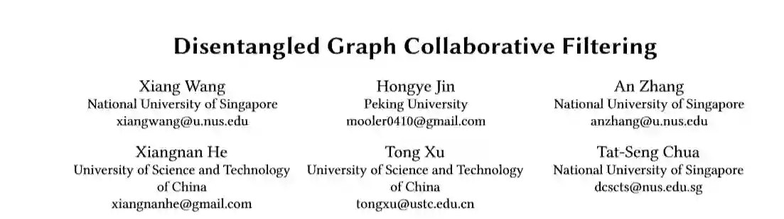 在这项工作中,我们会以用户意图的更细粒度特别注意用户与项目之间的关系。因此,我们设计了一个新模型,即解缠图协同过滤(DGCF),以解开这些因素并产生解开的表示。具体来说,通过对每个用户项目交互的意图分布进行建模,我们可以迭代地细化意图感知交互图和表示形式。同时,我们鼓励不同意图的独立性。这导致了纠缠的表示,有效地提取了与每个意图有关的信息。我们在三个基准数据集上进行了广泛的实验,并且DGCF在一些最新模型(如NGCF [40],DisenGCN [25]和MacridVAE [26])上取得了显着改进。进一步的分析可以深入了解DGCF在消除用户意图和表示可解释性方面的优势。