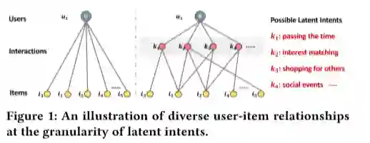 简介: 从交互数据中学习用户和项目的信息表示对于协同过滤(CF)至关重要。当前的嵌入功能利用用户-项目关系来丰富表示,从单个用户-项目实例演变为整体交互图。然而,他们在很大程度上以统一的方式对关系进行建模,而忽略了用户采用这些项目的意图的多样性,这可能是为了消磨时间,出于兴趣或为家庭等其他人购物。这种对用户兴趣进行建模的统一方法很容易导致次优的表示形式,无法对各种关系进行建模,也无法使用户的意图分解开来。