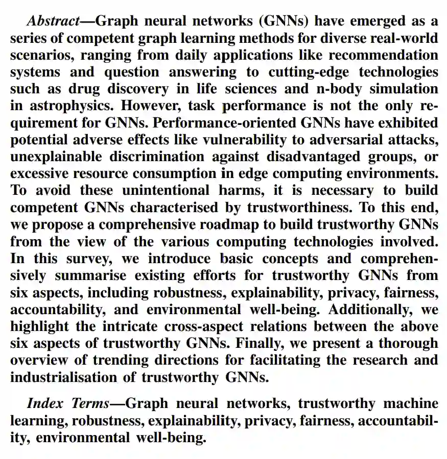 基于上述需求,人们愈发渴望基于图神经网络系统是可信的。在这样的背景下,这篇综述旨在总结“可信图神经网络(Trustworthy GNNs)”的最新进展,为相关研究人员和从业人员提供技术路线图,并为可信图神经网络的未来研究与产业化发展提供方向。
