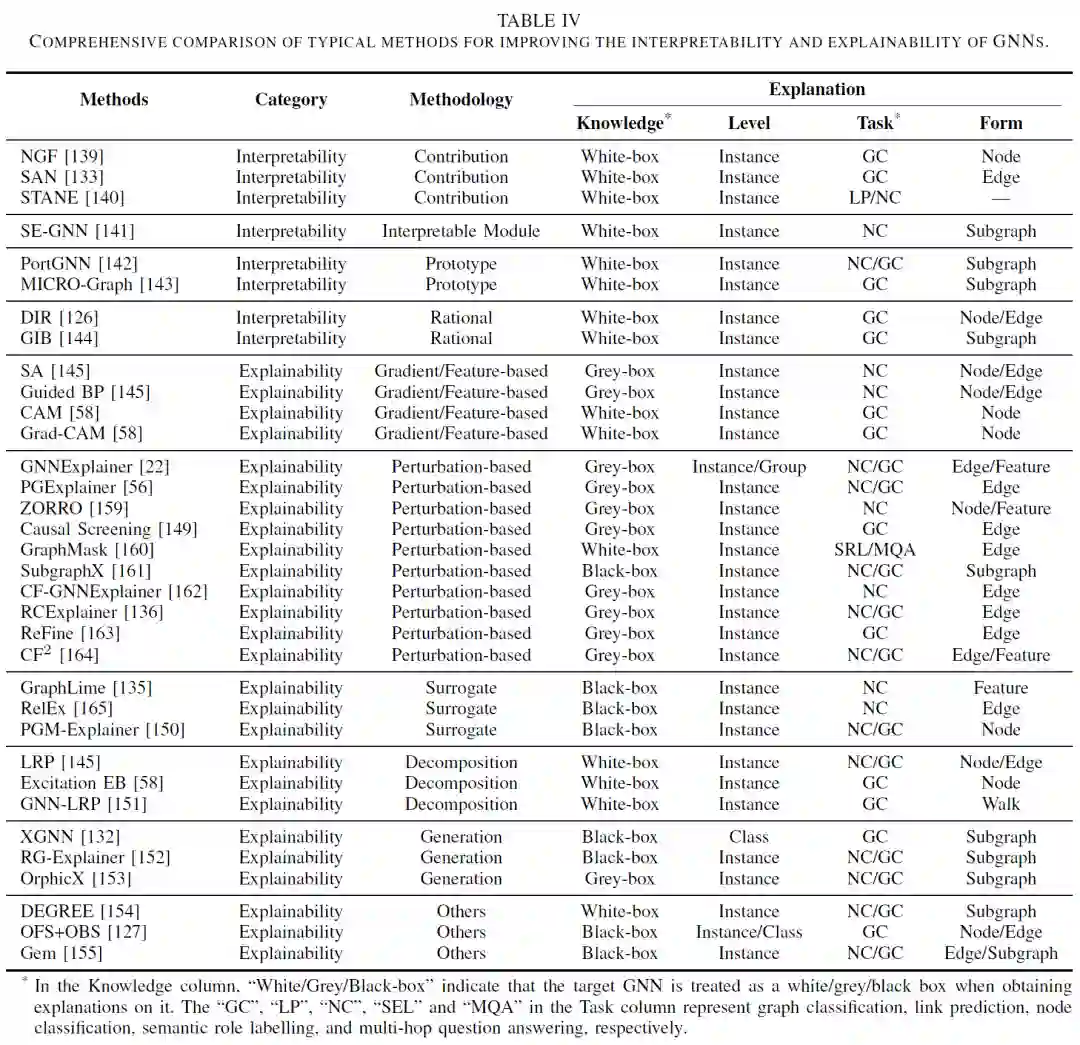 在介绍了解释形式、解释方法的类别等基本概念后,该综述将涉及图神经网络可解释性的工作分成了自解释(interpretable GNNs)和事后解释(post-hoc explainers)两类。自解释(Interpretable GNNs)主要包含了贡献估计(contribution estimation)、引入可解释模块( introduction of interpretable module)、嵌入空间原型学习(embedding prototype learning) 和依据生成方法(rationale generation methods)。事后解释(post-hoc explainers)主要包含了基于梯度/特征的方法(gradient/feature-based methods)、基于扰动的方法(perturbation-based methods)、代理模型方法(surrogate methods)、分解方法(decomposition methods)、生成方法(generation methods)和其他方法(other methods)。