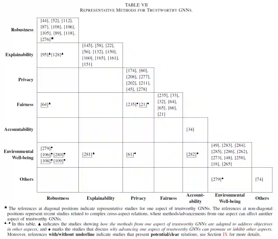 当前促进图神经网络可信性的研究主要集中在上述六个维度中的一个,该综述提出构建可信图神经网络不能忽视上述六个可信维度之间的关系,并从如下两个角度对此进行了总结: