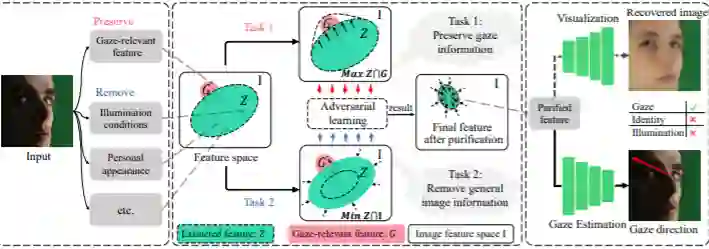 视线估计算法基于用户的面部图片计算其视线方向。然而,面部图片中除包含有效的人眼区域信息外,仍包含众多的视线无关特征,如个人信息、光照信息。这些视线无关特征损害了视线估计的泛化性能,当使用环境更改时,视线估计算法的性能也会出现大幅度的下降。在本工作中,我们提出了一种基于特征纯化的视线估计算法,算法利用对抗训练实现了视线特征的纯化。在纯化过程中,算法保留了视线相关特征而消除视线无关特征。通过利用此特征纯化算法,方法在多个数据集上达到了领先的性能。