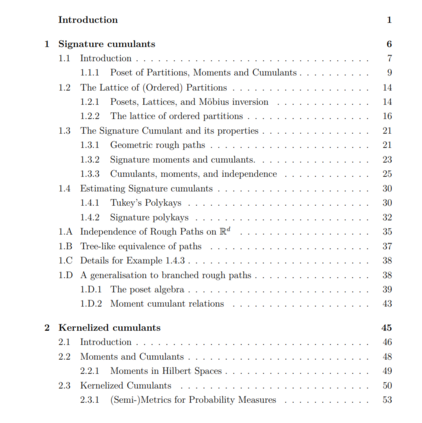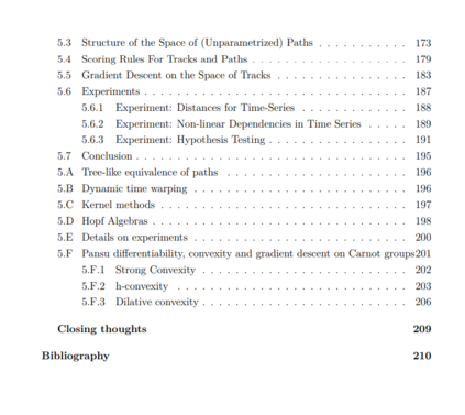 在本论文中,我们考虑了从随机分析和代数到统计和机器学习的工具的应用。其中大多数工具是已知为签名方法的不同形式。在过去的70年里,签名在数学的几个不同领域被发现和重新发现。简而言之,它将一个在向量空间中演变的路径映射到包裹同一空间的一个群体。它对统计如此有用的原因有两个:一是它的不变性集在许多应用中都非常受欢迎;二是其图像群体结构严密,非常适合使用代数工具进行数学研究。这里的主要目标是研究如何使用签名来表示给定路径的统计属性,以及如何将这些属性应用于机器学习。这个目标表现为 - 除其他事项外: • 一种用于签名的新型累积量,具有独特的组合属性,可用于表征路径的独立性, • 在再生核希尔伯特空间上的累积量,与签名累积量有关,尽管没有明确使用签名, • 将签名推广到其他类型的特征映射到非交换代数, • 具有初始拓扑的特征映射,捕捉随机过程滤波的属性, • 以及一系列得分规则与相关的散度、熵和路径的相互信息,这些都尊重它们的群体结构。 这些被划分为单独的、自成体系的章节,可以互相独立阅读。
