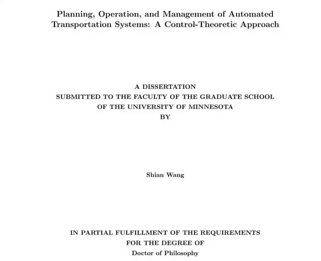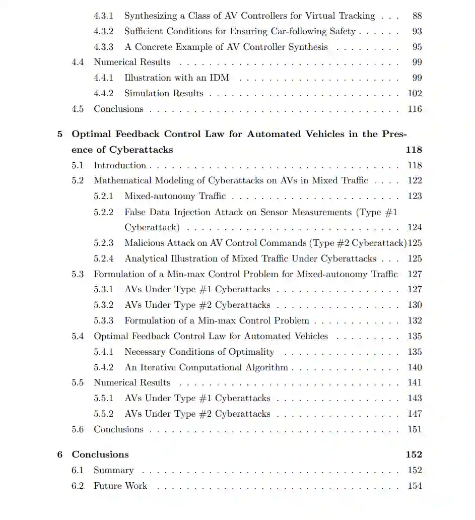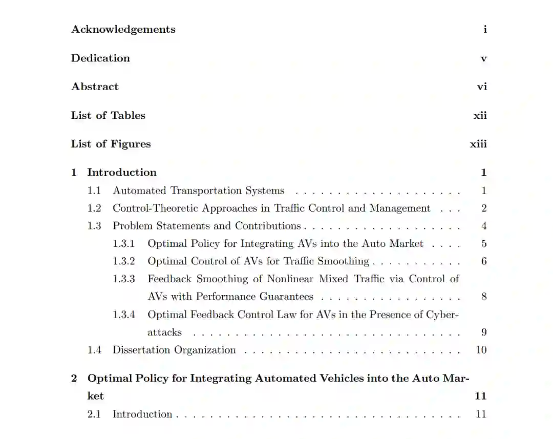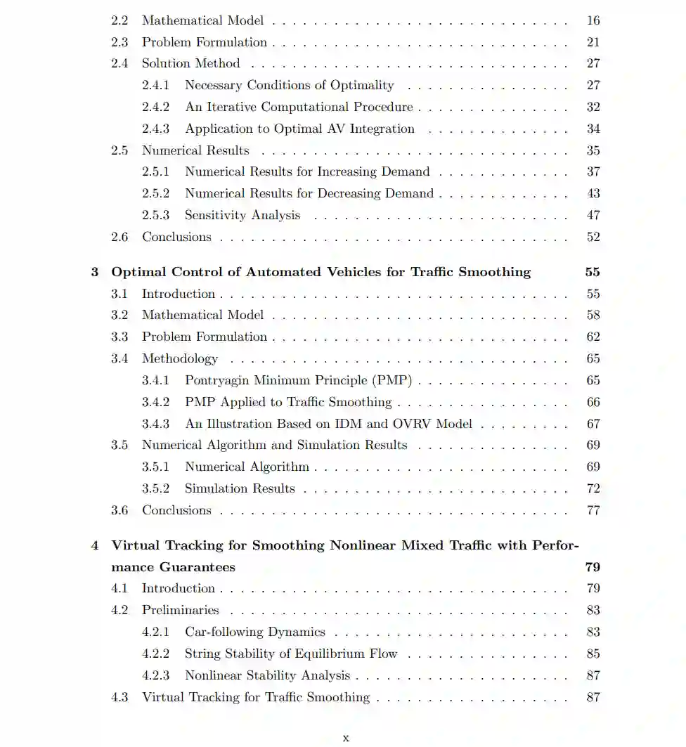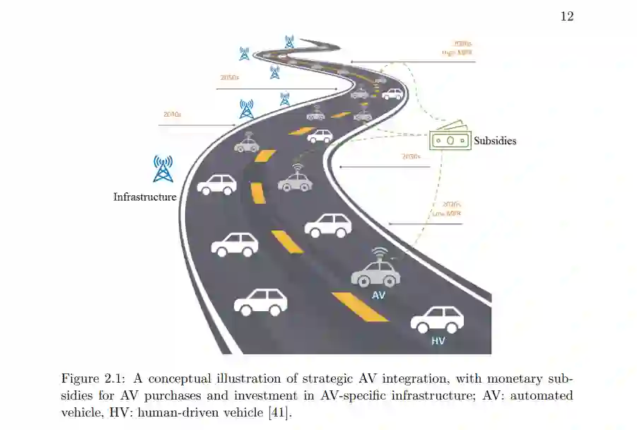 随着5G网络和无线通信等新兴技术的出现,自动驾驶汽车(automated vehicles, AVs)有望越来越多地为旅行者提供服务,并提供大量好处,如增强交通稳定性、减少能源消耗、优化停车位分配等。随着人类驾驶汽车(HVs)逐渐被自动驾驶汽车(AVs)取代,汽车市场将迎来一个过渡期。在这一过渡过程中,预计将出现许多机遇和挑战。为了更好地为自动驾驶汽车的到来做好准备,本文旨在从控制理论的角度,在未来交通系统的规划、运行和管理的背景下,解决车辆自动化带来的有趣而紧迫的问题。鉴于过渡时期HVs和AVs不可避免的共存,本文建立了一个连续时间的动态模型,以捕捉这两类车辆市场份额的交互时序演化。建立了一个离散的选择模型,并将其融入到动态模型中,用于描述客户选择HVs或AVs的可能性。为了实现自动驾驶汽车在时间上融入汽车市场,将货币补贴和对自动驾驶汽车专用基础设施的投资作为促进自动驾驶汽车采用的决策变量。进一步,建立了一个最优控制问题,目标是在任何给定的有限规划期限结束时实现期望的市场渗透率(MPR),同时最小化自动驾驶补贴和基础设施投资的成本。通过求解形式化的优化问题,确定了时间依赖的最优自动驾驶集成策略,允许政府机构以自适应方式补贴自动驾驶购买和投资于未来的交通基础设施。所提出的方法在各种需求模式下,如增加、减少和随机需求下都是有效和鲁棒的。通过系统的成本效益分析和灵敏度分析,评估自动驾驶系统集成的可取性。研究结果为政府机构制定自动驾驶系统整合的长期战略规划政策提供了重要的管理见解。尽管适当的激励政策可能会加速自动驾驶汽车的采用,但预计在未来30年左右的时间里,MPR将保持相对较低的水平,导致主要由人类驾驶的混合交通流,包括HVs和自动驾驶汽车。由于驾驶员的集体行为,均匀交通流在某些流型中已被证明是不稳定的,导致了观察到的走走停停的波动。即使在没有合并、瓶颈或换道的情况下,这些交通波也会出现,并可能导致更多的能源消耗和排放。利用车辆自动化的优势,本文开发了一种方法,通过在以人为主导的交通流中对一小部分自动驾驶汽车进行最优控制,来平滑不稳定的交通流。这些受控自动驾驶汽车在混合自主交通中充当移动执行器,而不会改变人类视觉系统的正常运行方式。我们建立了一个通用的框架来描述混合交通流及其动力学,它遵循车辆跟驰原则。基于该框架,以最小化速度干扰为目标,综合了自动驾驶汽车的最优反馈控制器,从而实现了更平滑的交通。根据Pontryagin极小值原理所规定的最优性必要条件,提出了一种确定最优AV控制策略的计算算法。通过HVs和AVs的智能驾驶员模型(IDM)和最优相对速度(OVRV)模型进一步说明了所提方法的总体框架,以验证所提方法在交通平滑、燃油经济性和尾气排放方面的有效性。