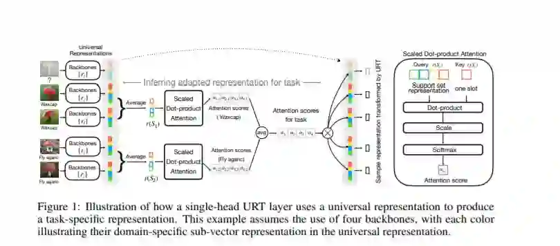 少样本分类的目的是在只有少量样本的情况下识别不可见的类。我们考虑了多域少样本图像分类的问题,其中不可见的类和例子来自不同的数据源。人们对这个问题越来越感兴趣,并激发了元数据集等基准的开发。在这种多领域设置的一个关键挑战是有效地整合来自不同训练领域集的特征表示。在这里,我们提出了一个通用表示Transformer(URT)层,该元学会通过动态地重新加权和组合最合适的特定于领域的表示来利用通用特性进行少样本分类。在实验中,我们表明,URT在元数据集上设置了一个新的最先进的结果。具体来说,与竞争方法相比,它在数据源数量最多的情况下实现了最佳性能。我们分析了URT的各种变体,并给出了一个可视化的注意力分数热图,以阐明该模型是如何执行跨领域泛化的。