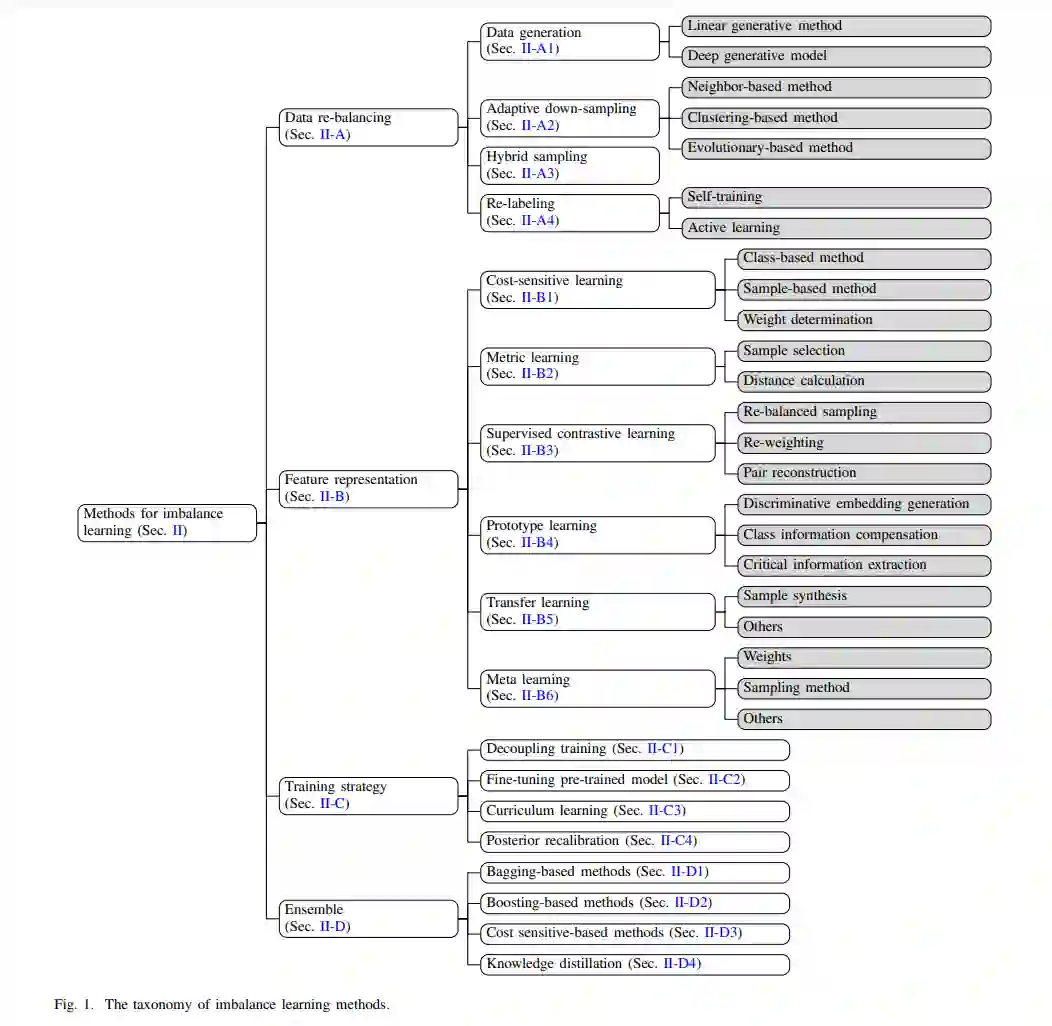 随着数据可用性的扩展,机器学习(ML)已成为学术界和工业界技术进步的前沿。这些机器学习模型被精心设计,以适应特定的数据分布,并随后应用于各种下游任务,从预测分析到自动决策系统。因此,机器学习模型的性能受到训练数据质量和分布的深刻影响。具有代表性、多样化且经过精心预处理的数据确保模型不仅准确,而且在不同的环境和挑战中具有鲁棒性和广泛的泛化能力。 然而,自然数据分布本质上复杂且经常存在缺陷。在这些挑战中,不平衡数据分布尤其突出,反映了各个领域普遍存在和自然产生的差异。例如,在金融领域,欺诈行为的实例相较于合法交易来说相对稀少,这使得模型难以准确地检测这些异常。在医疗领域,稀有疾病在医学数据集中可能被低估,这为开发稳健的诊断模型带来了重大挑战。在工业领域,质量控制系统常常需要识别稀有的产品缺陷,而这些缺陷可能会被大量合格产品所掩盖。这些情境不仅使机器学习模型的训练更加复杂,而且对系统的鲁棒性提出了更高要求。 通常,不平衡的数据分布显著影响机器学习模型的性能和实用性。这些模型通常在高资源组上表现良好,这些组的数据充足,但在低资源组上表现较差,后者的数据稀缺,导致数据分布的界限模糊。因此,尽管机器学习模型可能在整体上表现令人满意,但在这些低资源组中的有效性会显著降低。然而,这些低资源组往往在现实世界的应用中更为重要。例如,在医学诊断中,由于数据不足未能检测到稀有疾病,可能导致漏诊和不充分的患者护理。同样,在金融系统中,无法识别稀有的欺诈实例可能导致重大财务损失和安全性受损。机器学习模型忽视这些稀有但关键的实例,降低了自动决策系统在实际应用中的效用和安全性。 为应对这些挑战,机器学习领域已提出了一系列方法,我们将其组织为四个基本类别——数据重平衡、特征表示、训练策略和集成学习——每个类别都与机器学习过程中的关键环节相对应。数据重平衡技术对于调整数据分布以更好地进行表示至关重要,采用了如过采样少数类和欠采样多数类等方法。这一调整对于防止模型过度偏向多数类样本至关重要,符合机器学习中的数据准备阶段。特征表示策略增强了准确捕捉和表示与少数类样本相关信息的能力。这一改进在特征工程阶段至关重要,使得模型能够有效地从所有样本中学习并做出预测。先进的训练策略调整学习算法,以最小化其对多数类样本的内在偏见。这一训练阶段的关键调整确保了学习过程的包容性,平等地考虑所有样本。最后,集成方法通过组合多个模型,属于机器学习过程中的模型集成部分。这些方法利用多个算法的优势,以潜在地减少由不平衡数据引发的偏差,从而提高最终模型输出的鲁棒性和准确性。通过根据机器学习的基础过程对方法进行分类,这一分类不仅有助于全面的领域调查,还阐明了这些策略背后的动机,帮助实现特定目标。此调查还探讨了不平衡在不同数据格式中的表现,包括图像、文本和图形,突出了每种格式的差异、独特的挑战和所需的适应性。这一探索至关重要,因为它加深了对每种数据格式的理解,并有助于为复杂数据格式场景制定针对性的机器学习策略。 本调查的贡献总结如下: