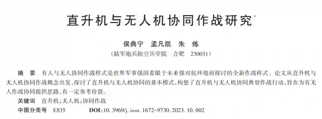 有人与无人协同作战样式是世界军事强国着眼于未来强对抗环境而探讨的全新作战样式。论文从直升机与 无人机协同作战概念出发,探讨了直升机与无人机协同的基本模式,构想了直升机与无人机协同典型作战行动,旨在为有无 人作战协同提供思路,有一定参考价值。鉴于直升机独特性能优势,世界军事强国正加 紧直升机与无人机协同应用研究并投入战场使用, 深入探索无人机与直升机的集成方法,研究直升机 与无人机协同作战概念及关键技术,形成完善的作 战理念及战术战法,致使未来无人机和直升机在相 互协同时,以最有效的方式发挥各自优势,共享战 场信息,进行相互支援、相互保障和相互掩护,协同 完成作战任务,达成“1+1”大于2。
