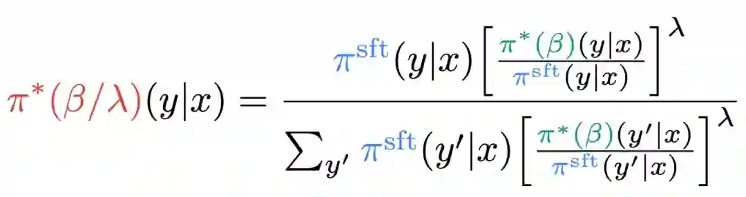 平衡奖励和正则化的的参数 β 至关重要:太少会导致在奖励上过拟合 (Reward hacking),太多则会有损对齐的成效。 那么,如何选择这个用于平衡的参数 β 呢?传统方法是试错法:对每一个 β 值训练一个新的模型。虽然有效,但这种方法计算成本高昂。 是否可以在不重新训练的情况下探索奖励优化和正则化之间的权衡?DeRa 的作者证明了不同正则化强度 β/λ 的模型可以视为几何加权平均 (gemetric mixture)。通过调整混合权重 λ 来实现,DeRa 能够在解码时近似不同正则化强度,无需重新训练。