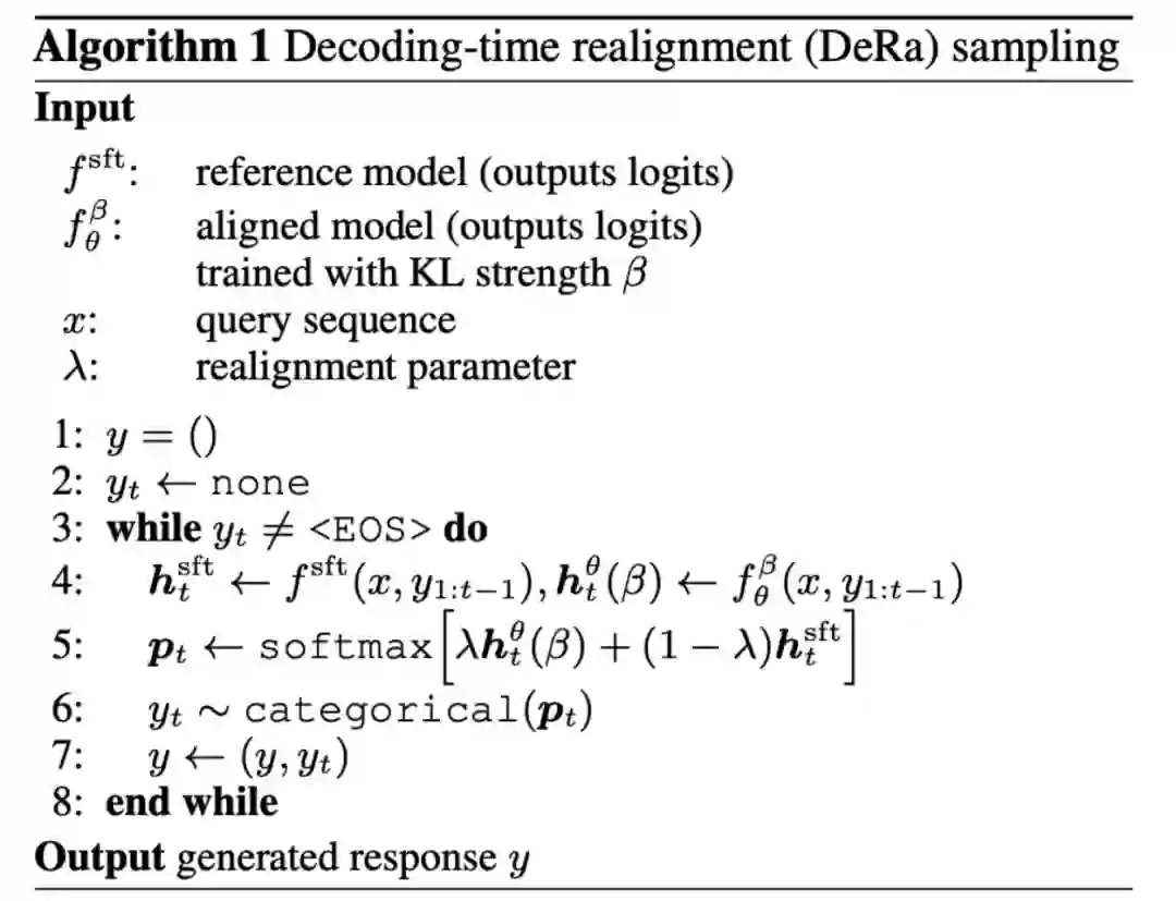 这个发现启发作者提出解码时重新对齐(Decoding-time realignment, DeRa)。它是一种简单的采样方法:在解码时对 SFT 模型和对齐的模型在原始输出 (logits) 上做插值,从而逼近各种正则化强度。