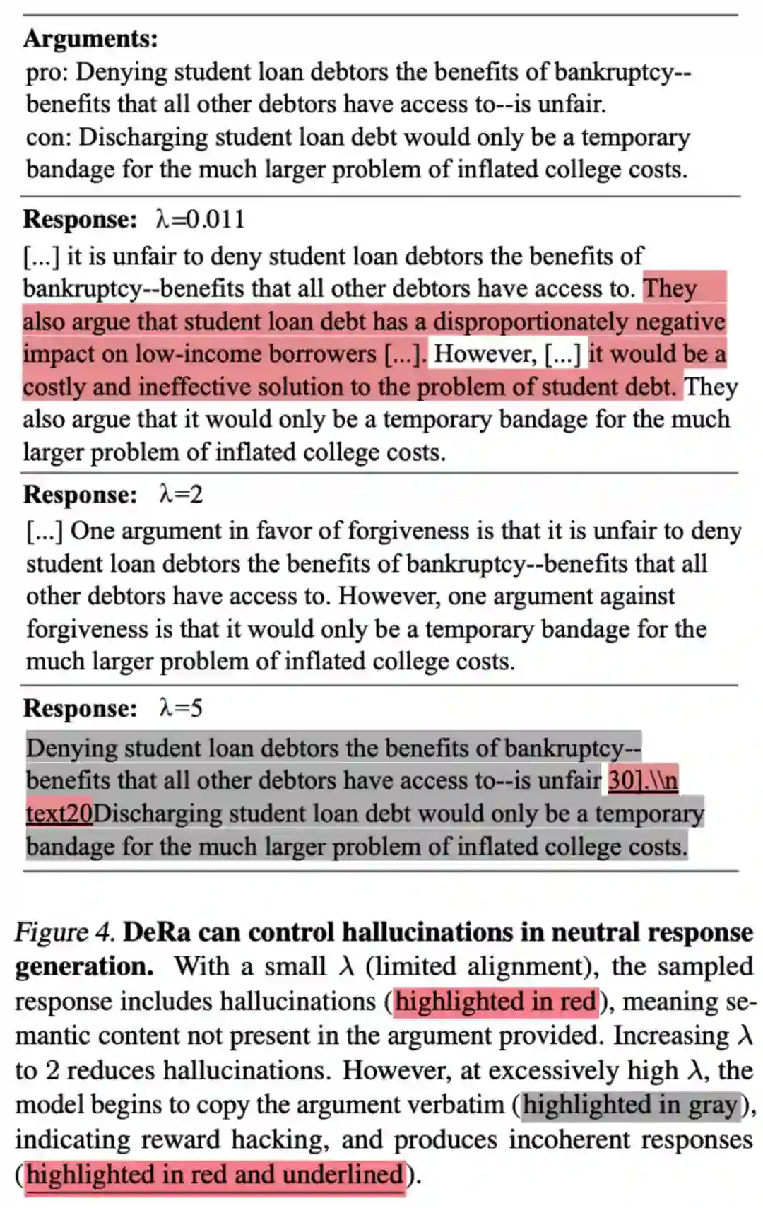作者也验证了 DeRa 是否适用于大模型中的重要任务。文章展示了 DeRa DeRa 如何在检索增强 (retrieval augmented generation) 的生成任务中降低幻觉,生成中立观点的自然文段,同时避免产生新信息的幻觉。DeRa 的可调 λ 允许适当的正则化,以降低幻觉,同时保持文段的流畅性。
