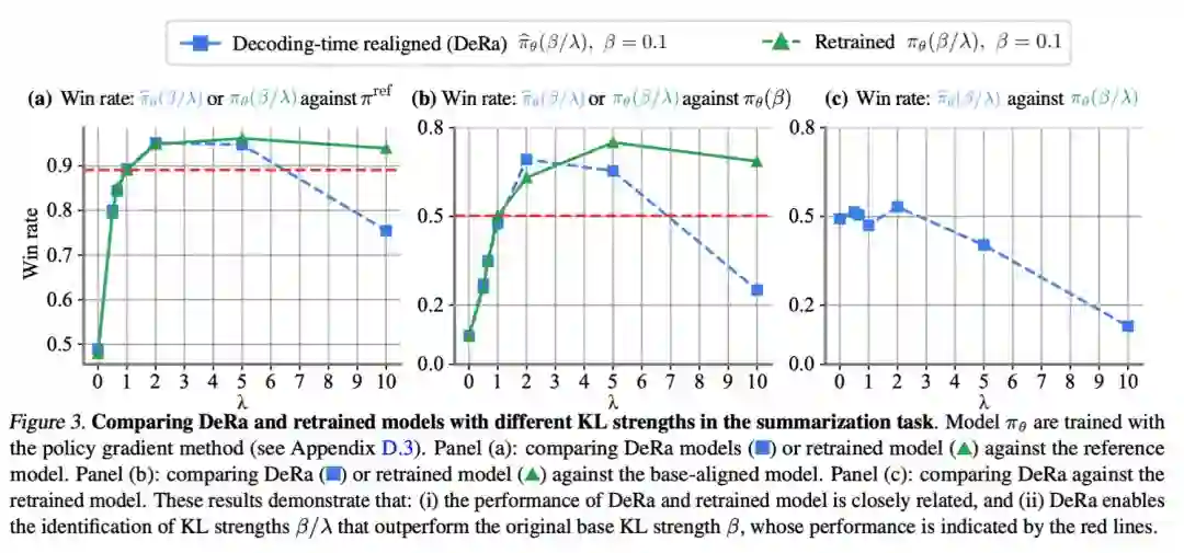 作者也验证了,我们可以使用 DeRa 来识别适当的正则化强度,然后只在这些值上重新训练模型,以达到降低实验开销的目的。 图 3 的实验结果表明,DeRa 识别的 KL 强度 β/λ 优于基础 KL 强度 β(如红线所示),这一点在摘要任务中得到了验证。